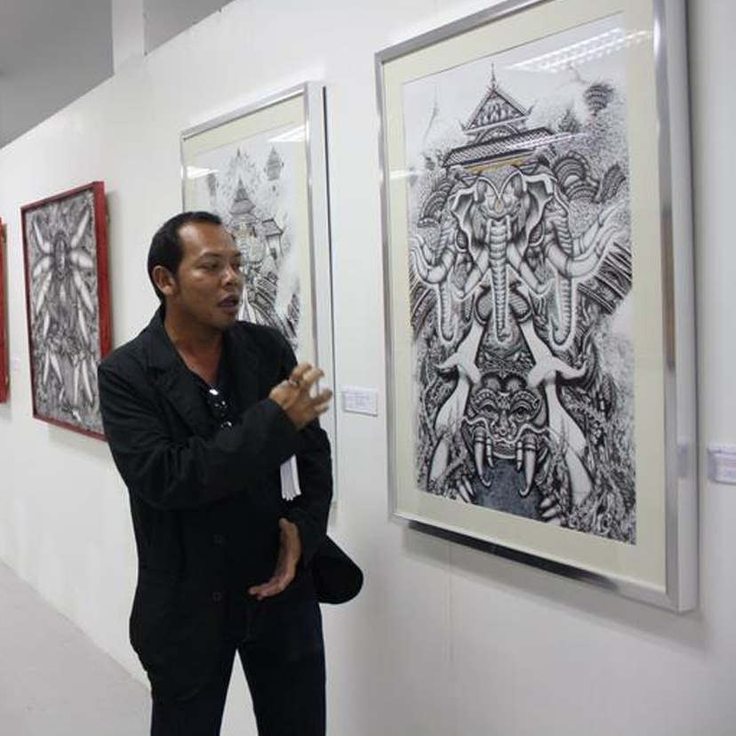 **왈롭 시센(Wallop Sisen)**은 태국을 기반으로 활동하는 현대 예술가입니다. 그의 작품은 태국 전통 사원 건축, 불교적 상징(연꽃, 후광 등), 그리고 초현실주의 요소의 결합이 특징입니다. 작가는 익숙한 상징들—눈이 달린 거대한 생명체 위에 사원 건물을 배치하거나, 떠다니는 기하학적 오브제를 사용하는 등—을 해체하고 재구성함으로써 영적 여정, 신앙, 현실과 초월의 경계라는 주제를 탐구합니다. 그는 선명한 파란색, 노란색, 주황색과 같은 생생하고 역동적인 색채 팔레트를 사용하여 꿈결 같으면서도 강렬한 시각적 효과를 창조합니다. 왈롭 시센은 전통적 요소에 현대적 상상력을 불어넣어 태국 예술의 새로운 지평을 제시합니다.