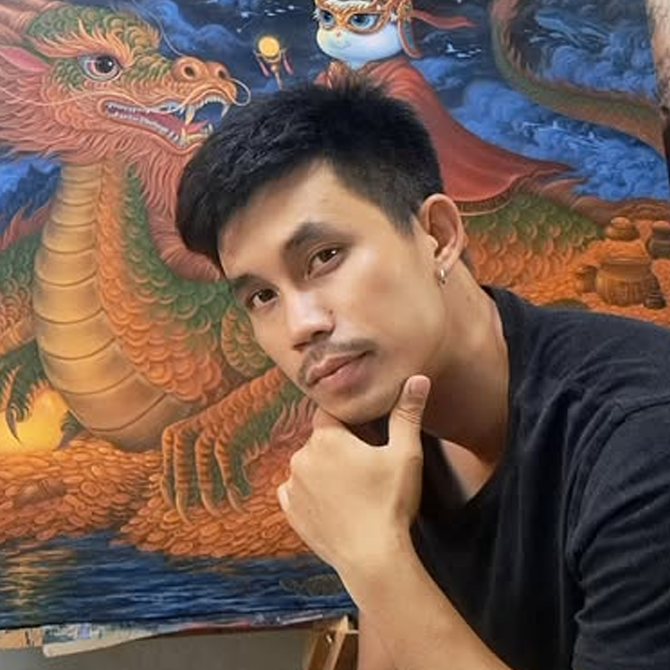 **차이찬 능파놈(Chaichan Nuengpanom)**은 태국의 영적, 시간적 본질을 포착하는 감성적인 풍경화와 가슴 뭉클한 초상화로 유명한 저명한 태국 현대 예술가입니다. 그는 짜오프라야 강변의 안개 낀 풍경부터 울창하고 빛나는 열대우림의 잎사귀에 이르기까지, 자연 세계의 고요한 리듬에서 영감을 얻습니다. 그의 작품은 태국의 심오한 역사적 유산과 급변하는 현재를 잇는 사색적인 다리 역할을 합니다. 주로 유화와 아크릴로 작업하는 차이찬의 독특한 기법은 강렬하고 분위기 있는 색채를 섬세하고 서예적인 선과 겹쳐 쌓는 것이 특징이며, 종종 미묘한 태국 전통 모티프나 상징을 통합합니다. 그의 작품은 단순한 묘사를 넘어 **무상(Anicca)**과 균형의 개념에 대한 명상입니다. 그의 연작인 는 방콕 예술문화센터에서 전시되었으며, 비평가들은 “태국 유산의 침묵하는 시를 보편적으로 공명하는 시각 언어로 번역하는” 그의 능력에 찬사를 보냈습니다. 차이찬 능파놈은 계속해서 이러한 탐구를 심화하며, 관람객들을 태국 영혼의 아름다움과 복잡성에 대해 고요히 성찰하는 순간으로 초대합니다.
