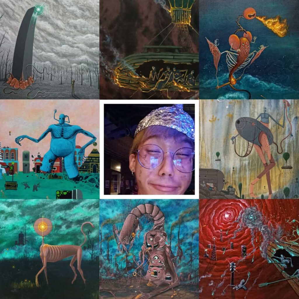 Andew Chaiphak, an artist from Thailand, visualizes anxiety, desire, social satire, and the darkness within the human psyche through surreal imagination. His works feature grotesquely transformed creatures, robots and monsters, and mysterious landscapes, immersing viewers in a world that is at once familiar and strange. The surreal beings that fill his canvases create tension between fear and wit, while the metaphorically twisted landscapes reflect the hidden sides of contemporary society. Working in acrylic, oil, and mixed media, Andew’s paintings are distinguished by vivid colors and intricate details, offering an immersive experience reminiscent of reading a dystopian novel. His notable work, Fire-breathing Creature, reveals the duality of destruction and regeneration through a nightmare-like being exhaling flames, while the Red Spiral series visualizes social chaos and personal anxiety as swirling red vortices. Andew Chaiphak poses the question: “Is this mysterious world merely imagination, or is it the reality we choose to ignore?”