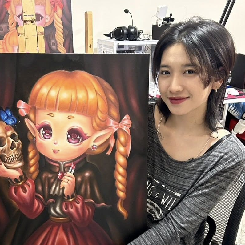 Mrs. Pacharawan Wattanawongsakul (Jane Kibari) was born on December 17, 2001, in Thailand. She graduated from the Faculty of Fine Arts, majoring in Painting, at Suan Sunandha Rajabhat University, and is currently a full-time artist specializing in character art. The core of her work revolves around her character, ‘Kibari.’ Jane describes Kibari as her childhood imaginary friend and a wizard full of courage and determination who continues to give her the strength to move forward. The artist aims to introduce Kibari to the world through her artwork and artistic designs. Her passion for drawing was ignited by her childhood love of watching cartoons, which led her to imagine the people around her as cartoon characters and inspired her dream of becoming a character artist.