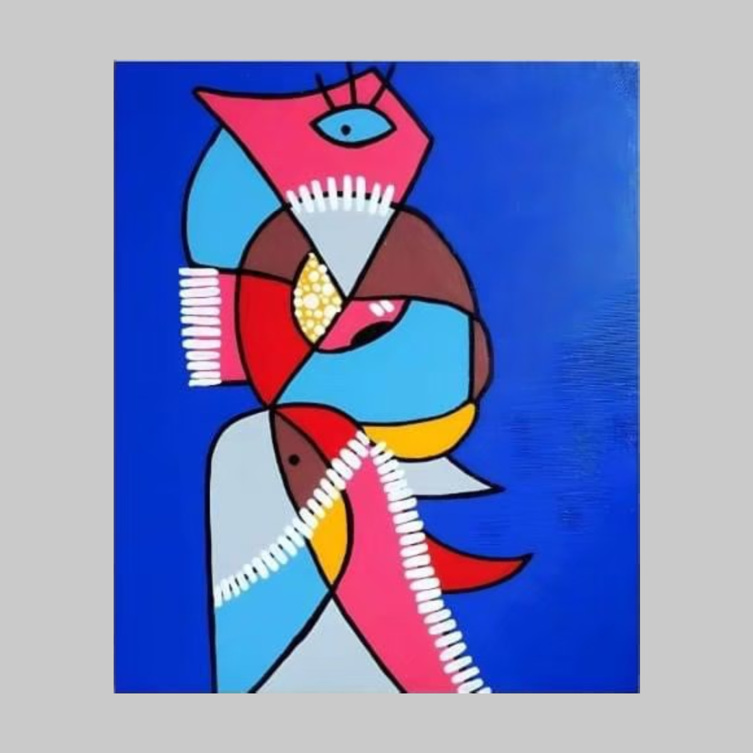 이 캔버스 위 아크릴 작품에서 Chaiyot Pueaithamung은 깊고 선명한 파란색 배경 위에 복잡하게 분할된 인물을 배치했습니다. 분홍색, 빨간색, 하늘색, 갈색으로 이루어진 형태들이 서로 맞물린 퍼즐처럼 구성되어, 따뜻한 색과 차가운 색의 시각적으로 흥미로운 상호작용을 만들어냅니다. 여러 개의 양식화된 눈들은 각기 다른 방향을 응시하며 다각적인 시점을 암시합니다. 작가의 특징인 하얀색 ‘스티치’는 장식적인 요소이자, 흩어진 조각들을 하나의 통일성 있는 추상적 전체로 묶어주는 개념적 실의 역할을 합니다.