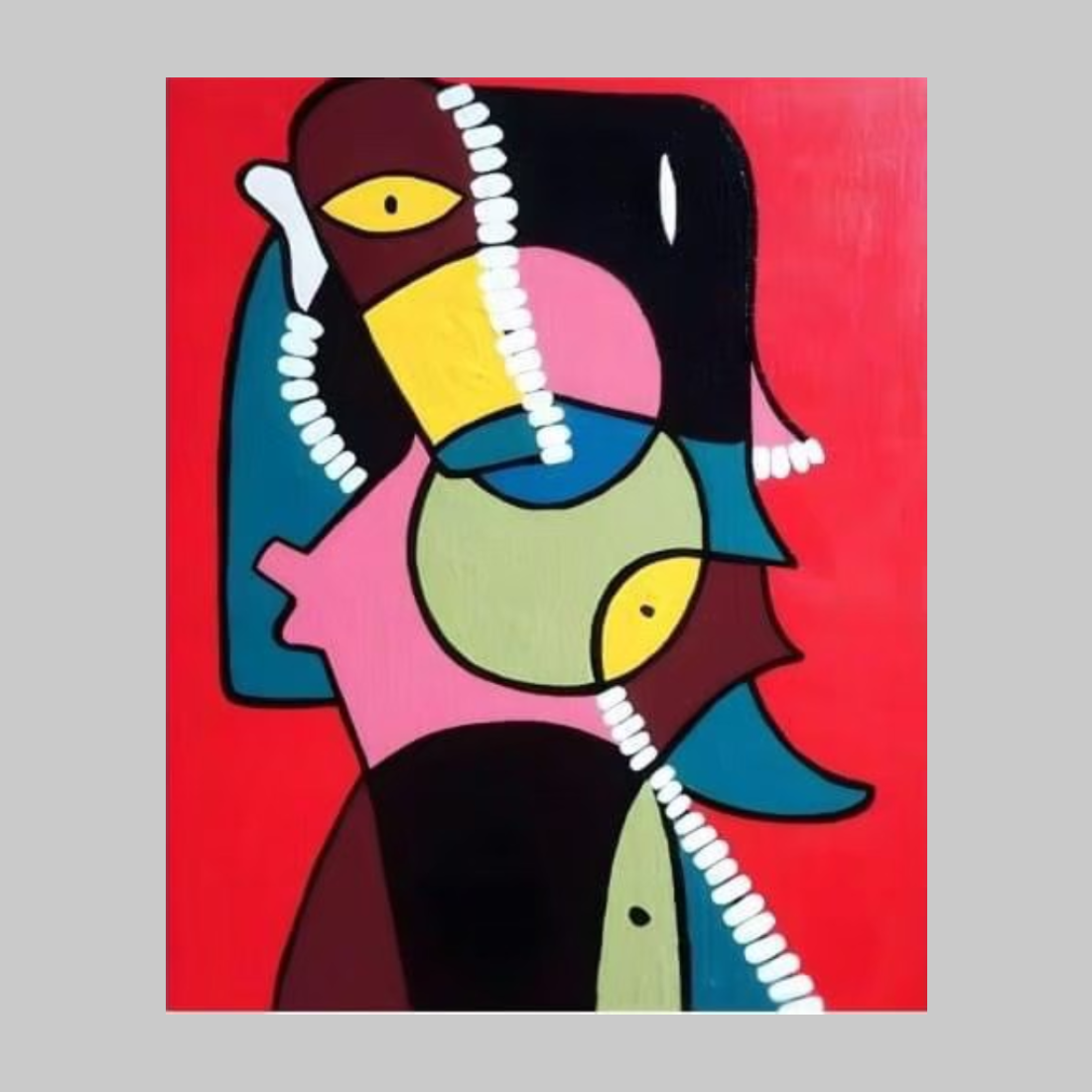 Chaiyot Pueaithamung의 이 캔버스 위 아크릴 작품은 불타는 듯한 붉은색 배경 위에 대담하고 추상적인 초상을 담고 있습니다. 인물은 작가의 특징인 하얀색 ‘스티치’의 수직선에 의해 눈에 띄게 양분되어, 내면을 드러내기 위해 ‘지퍼가 열리는’ 듯한 강력한 이중성의 감각을 만들어냅니다. 검은색, 분홍색, 차분한 녹색이 조화를 이루는 색상 팔레트와 구성을 단단히 잡아주는 두 개의 꿰뚫는 듯한 노란 눈이 특징입니다. 분할된 조각들과 그것들을 통합하는 스티치 사이의 역동적인 긴장감은 정체성과 숨겨진 복잡성이라는 주제를 탐구합니다.