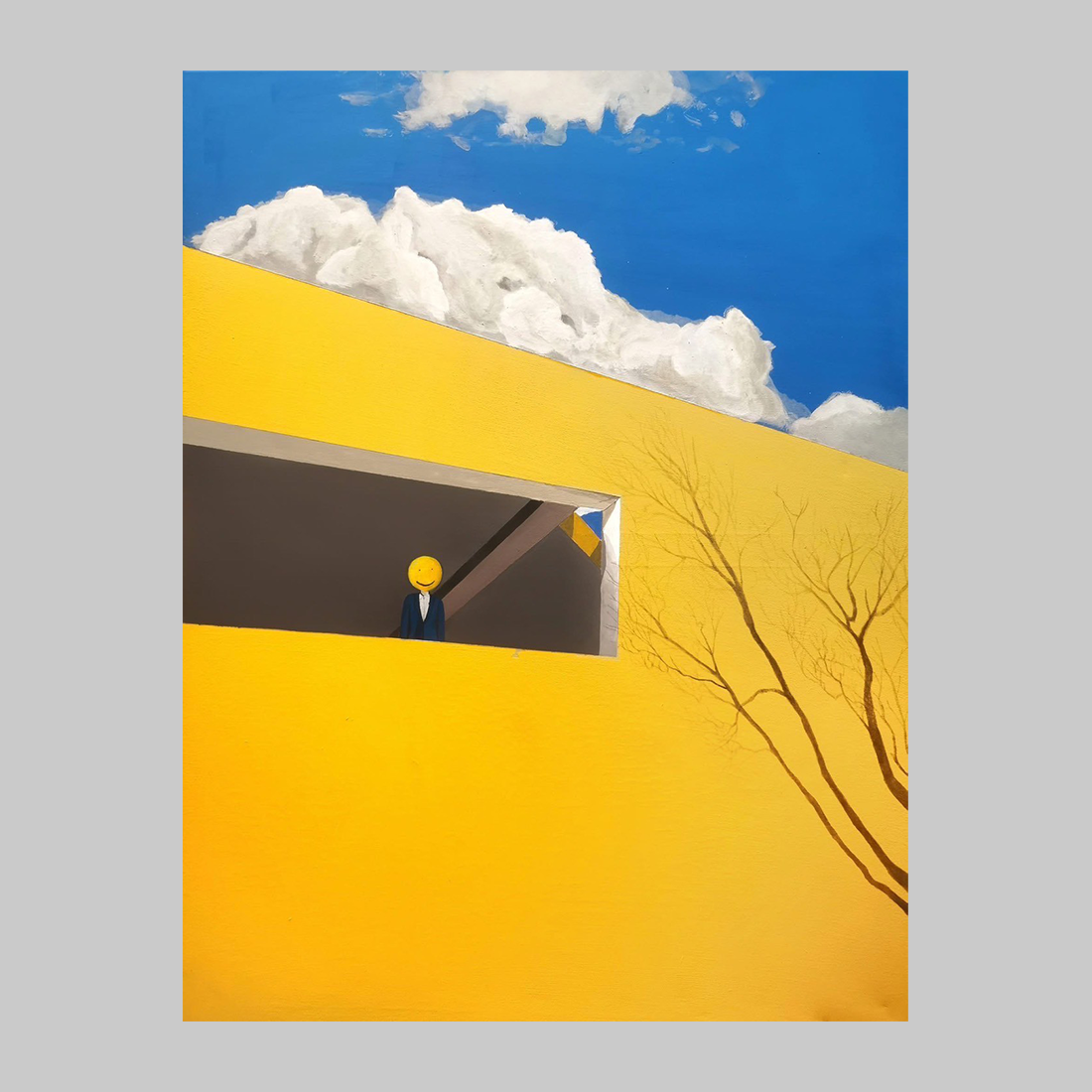 작품은 현대인이 사회라는 거대한 구조물(노란 건물) 속에서 마주하는 아이러니를 담고 있습니다. 표면적으로는 웃고 있는 스마일 마스크를 쓰고 있지만, 그 인물이 놓인 공간은 넓은 벽에 고립된 창문 안이며, 이는 고독과 불안을 은유합니다. 작가는 이 작품을 통해 관람객에게 겉보기에는 단순하고 밝아 보이는 일상 속에서 우리가 외면하고 있는 내면의 심리적 상태에 대해 질문을 던지고 있습니다.