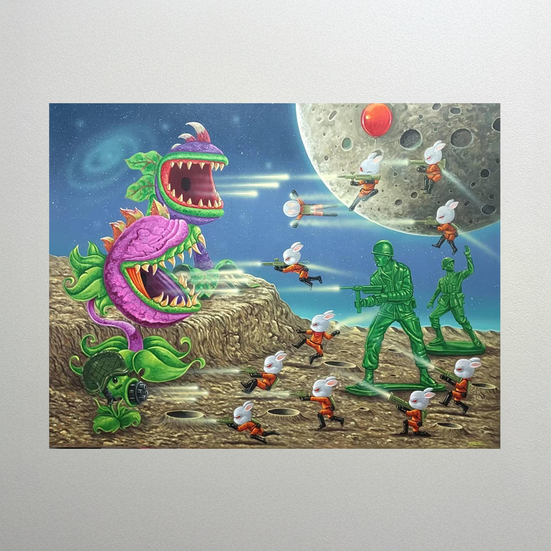 이 작품은 우주적 배경 속에서 거대한 식충 괴물과 초록색 병사들, 그리고 끝없이 몰려드는 토끼 군단이 뒤엉킨 초현실적 전장을 그립니다. 괴물의 입 안에는 사탕처럼 보이는 색채가 가득하고, 그 앞에서 벌어지는 전투는 위협적이기보다는 어딘가 익살스럽고 과장되어 있습니다. 작은 무기를 든 토끼들은 압도적인 존재들 앞에서도 멈추지 않고 돌진하지만, 그 행동은 영웅적이라기보다 습관적이고 자동화된 움직임처럼 보입니다. 초록색 병사들 역시 목적 없는 행진을 반복하며, 이 싸움이 왜 시작되었는지는 더 이상 중요하지 않은 듯합니다. 작가는 이 장면을 통해 욕망이 얼마나 쉽게 생존 본능, 소비, 경쟁으로 변질되는지를 풍자합니다. 달콤함을 연상시키는 색채와 캐릭터들은 파괴와 포식의 구조를 가리고, 관객은 웃음과 불편함 사이에서 이 전투를 바라보게 됩니다. 이 정원은 생명의 터전이 아니라, 끝없이 반복되는 욕망의 무대이며, 모두가 무언가를 삼키거나 삼켜지기 위해 존재하는 아이러니한 세계입니다.