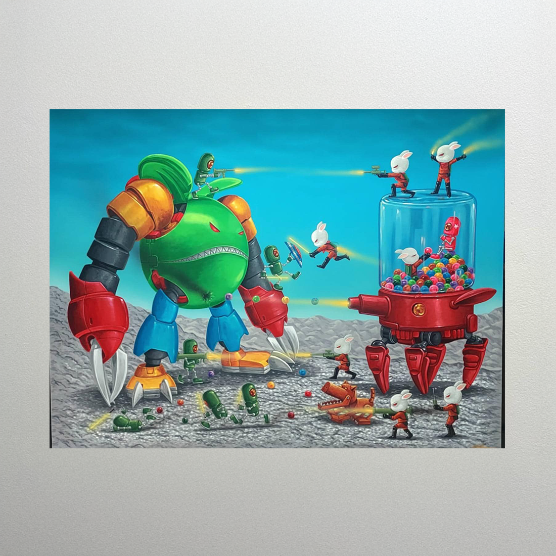 토끼 군단은 거대한 녹색 로봇(혹은 괴물)과 검볼로 가득 찬 캡슐 모양의 무기 플랫폼을 중심으로 전투를 벌입니다. 작은 총으로 무장한 토끼들은 적을 공격합니다. 이 전투의 목표처럼 보이는 검볼 기계는 사소하거나 덧없는 달콤함을 위해 벌어지는 무의미한 갈등을 풍자합니다. 이 작품은 욕망에 의해 촉발되는 경쟁과 폭력을 유치하고 부조리한 이미지로 왜곡합니다.