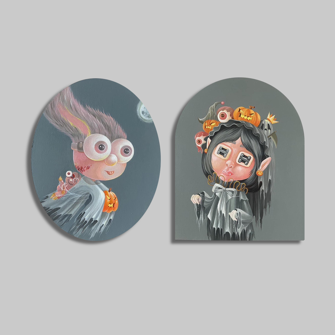 This work reinterprets Halloween or spooky themes in an adorable and whimsical manner. The circular frame contains a monster or ghost figure with large eyes and long hair ornaments resembling rabbit ears. The girl in the other arched frame wears a black cloak and a headdress adorned with pumpkins and bats. The cute appearance of the figures contrasts with the overall dark and subdued background, creating an atmosphere that is, as the title suggests, ‘too cute to spook.’ The piece explores the humor and innocence hidden within fear, suggesting that even terror can be a subject of play.