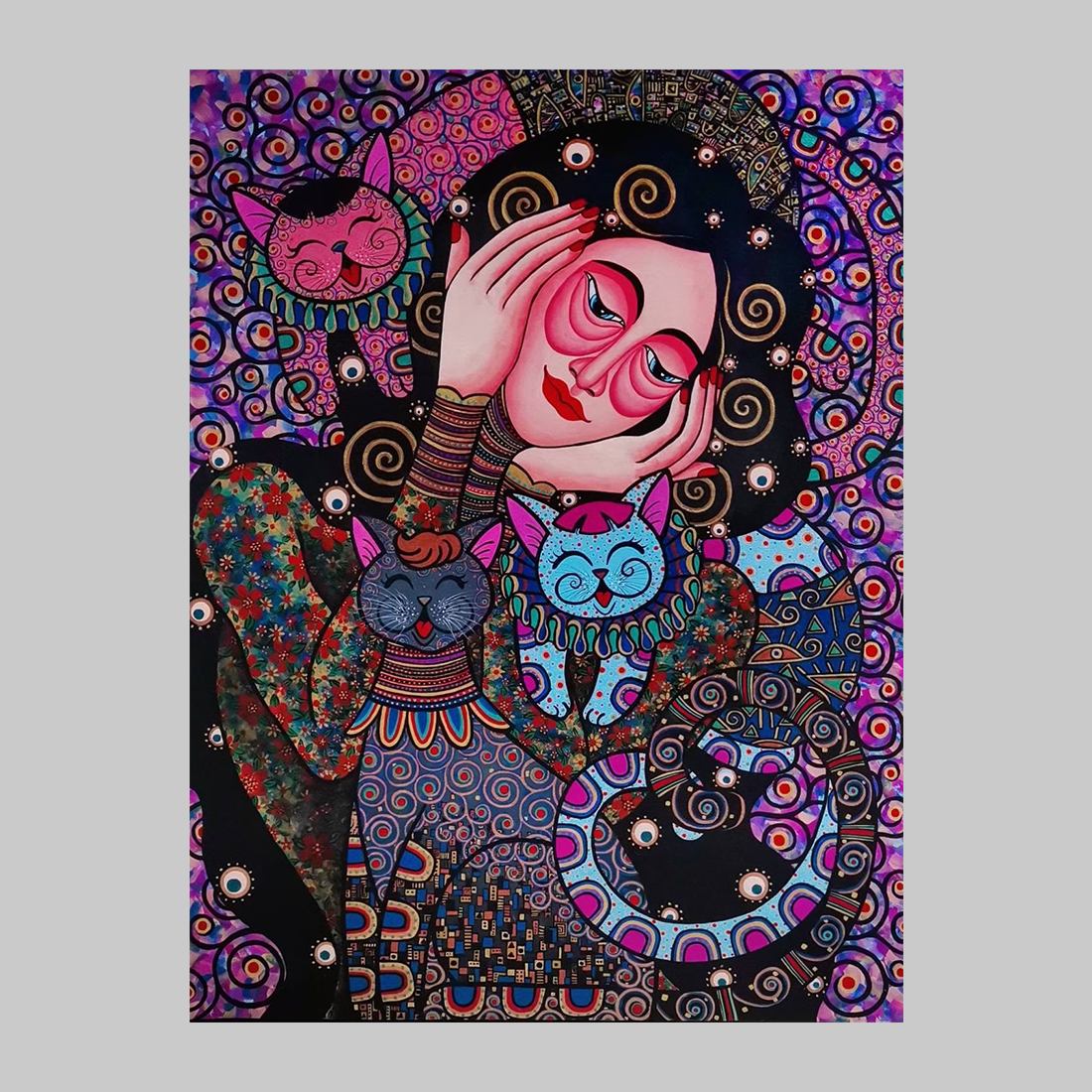 예술가 차야니사 스리위차난(Chayanisa Sriwichainan)의 ‘절대 사라지지 않는 행복’은 강렬하고 정교한 장식 패턴을 통해 내면의 평화와 영원한 행복을 탐구하는 매혹적인 작품입니다. 캔버스 중앙에 있는 여성은 두 손으로 얼굴을 감싸고 눈을 감은 채 고요한 휴식을 취하고 있습니다. 그녀의 몸과 배경은 클림트의 장식 예술을 연상시키는 소용돌이치는 나선형, 점묘법, 그리고 생동감 넘치는 모티프로 가득합니다. 그녀를 둘러싼 세 마리의 화려한 고양이는 안정감과 무조건적인 애정을 상징합니다. 여성의 평화로운 표정과 배경의 눈부신 움직임 사이의 대조는 세상의 복잡함 속에서도 그녀가 내면에 굳건한 안식처를 찾았음을 시사합니다. 이 작품은 절대 사라지지 않는 행복이 외부 조건이 아닌 가장 친밀한 유대감과 내면에서 발견되는 평온함에서 비롯된다는 것을 시각적으로 기념합니다.