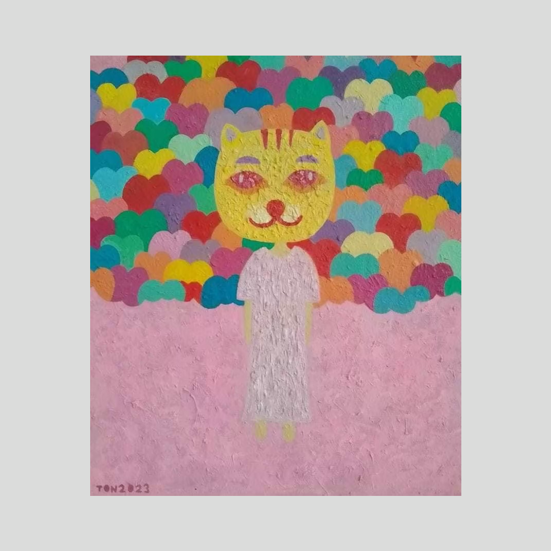 이 그림은 별이 빛나는 밤하늘을 닮은 점묘법 스타일의 파란 배경을 뒤로하고 서 있는, 다채로운 날개를 가진 천사 같은 인물의 측면을 묘사하고 있습니다. 인물은 가슴에 대담하고 추상적인 분홍색 심볼이 장식된 질감 있는 노란색 드레스를 입고 있어 작품에 신비로움과 상징성을 더합니다. 캐릭터의 표정은 입을 벌리고 있어 마치 노래를 하거나 말하는 듯한 즐거움을 줍니다. 작가의 두터운 물감 칠은 드레스와 날개에 거친 질감을 부여하여, 점으로 표현된 인상주의적 배경과 아름다운 대조를 이룹니다.
