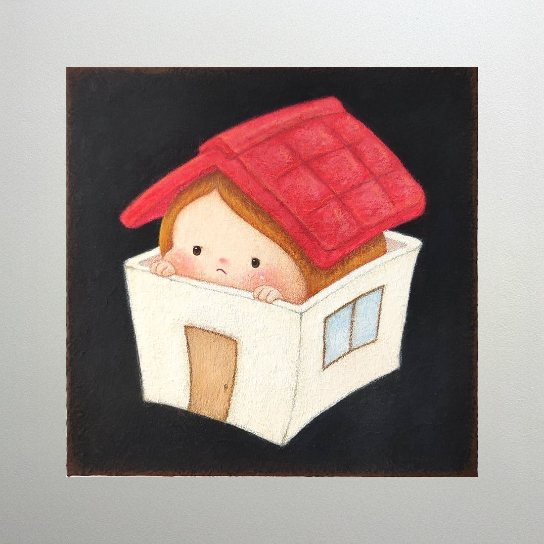 이 작품은 붉은 지붕과 하얀 벽으로 이루어진 작은 집 모양의 상자 안에 갇힌 불안하고 슬픈 표정의 인물을 묘사합니다. 제목에서 암시하듯, ‘Not Enough Space’는 물리적 공간뿐 아니라 현대 사회에서 개인이 느끼는 심리적 공간의 부족을 은유적으로 표현합니다. 역설적이게도 귀여운 이미지를 통해 주거 공간이나 관계 속에서 자신의 영역을 확보하지 못할 때 느끼는 고립감과 억압을 표현합니다.