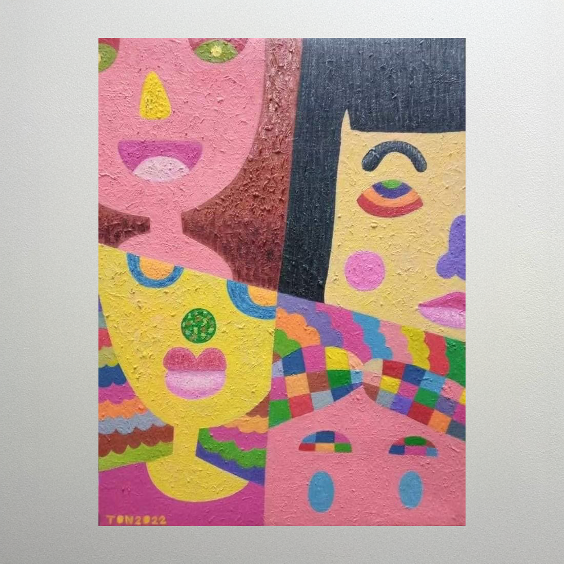 네 개의 얼굴이 마치 캔버스를 나누듯 교차하고 겹치는 구도로 배열되어 있습니다. 묵직한 붓놀림으로 표현된 강렬한 질감의 분홍색과 노란색 배경을 배경으로, 각 얼굴은 미소와 놀라움 등 다양한 감정을 표현합니다. 이 작품은 관계 속에서 서로 영향을 미치고 교차하는 인간의 복잡한 감정과 정체성을 탐구합니다. 경계가 허물어지는 얼굴들의 결합은 연결을 통해 자아가 형성되거나 변화하는 과정을 시각화합니다.