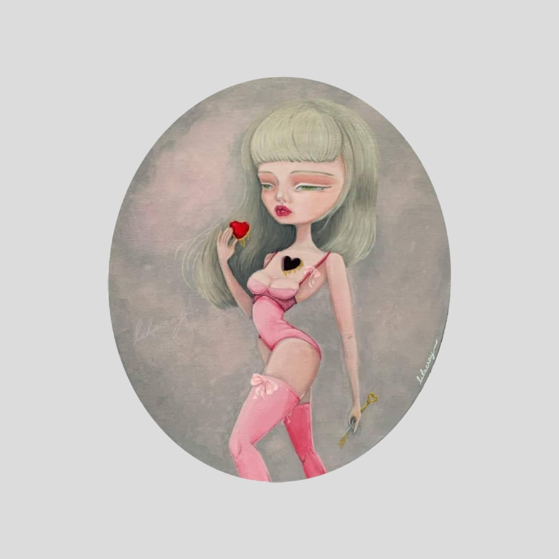 Fern Sirapassorn의 Willing Victim은 분홍색 속옷과 스타킹을 입은 인형 같은 소녀가 흐린 배경 속에 서 있는 모습을 담고 있다. 손에는 빨간 심장을 들고, 가슴에는 어둡게 비어 있는 심장이 자리해 욕망과 상처, 그리고 스스로를 내어주는 감정을 상징한다. 작품은 순수함과 긴장감을 동시에 담아내며, 욕망과 고통이 교차하는 몽환적 분위기를 표현한다.