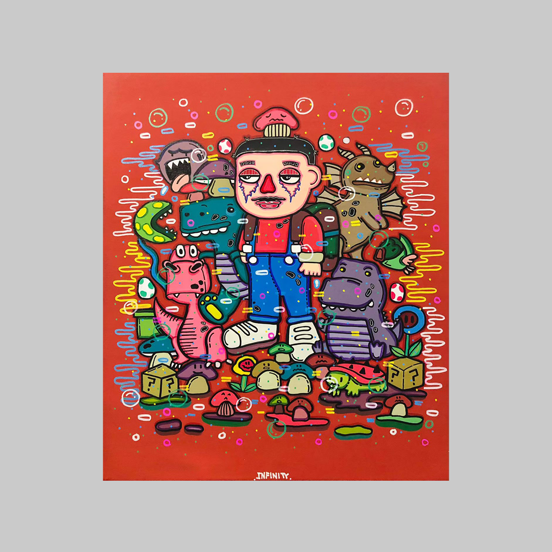 강렬한 붉은색 배경을 뒤로하고, 한 아이가 다양한 공룡과 버섯을 포함한 기묘하고 이국적인 생명체들에 둘러싸여 있습니다. 이 아이는 이 모든 생명체들의 **’수집가’ 또는 ‘수호자’**인 듯 보입니다. 이 작품은 무의식 또는 마음의 내면세계 속에 숨겨진 상상의 파편들을 시각화합니다.
