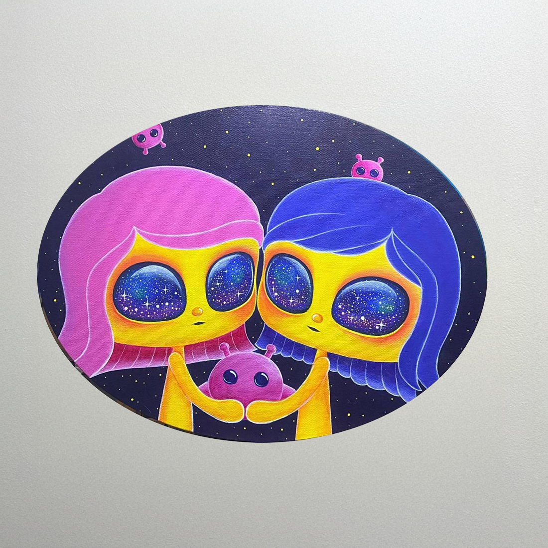 제목 그대로, **‘나를 안아줘’**라는 이 작품은 깊은 유대감과 애정을 표현한 따뜻한 초상화이다. 두 인물은 분홍색 머리카락과 파란색 머리카락을 가진 인물로 서로를 바라보며 중앙의 작은 생물을 다정하게 안고 있다. 눈: 두 인물의 큰 눈에는 밤하늘의 별들이 가득 차 있어, 그들이 우주의 존재이거나 광대한 꿈과 상상을 지닌 존재임을 암시한다. 눈에 반사된 별빛은 그들이 나누는 감정의 깊이와 순수함을 나타낸다. 색채와 분위기: 선명한 분홍색과 파란색이 노란 피부와 대비되며 시각적 에너지를 더한다. 어두운 우주를 배경으로 따뜻하게 빛나는 이 가족의 모습은 세상의 혼란 속에서도 변치 않는 사랑과 포옹의 힘을 상징적으로 보여준다.