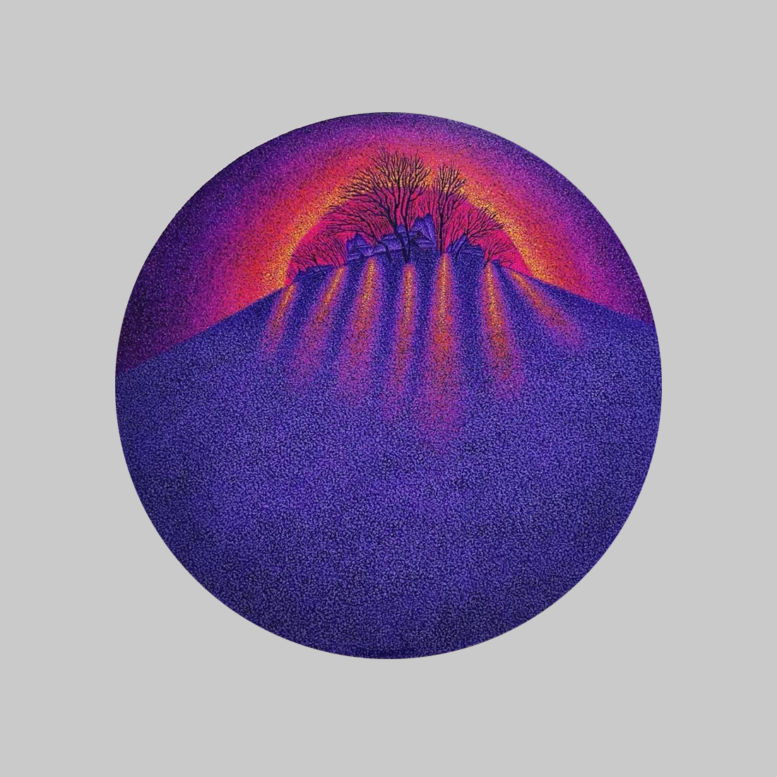 찌라삭 리우타이송의 은 원형의 화면 속에 신비로운 빛과 색채의 변주를 담아내어 자연의 정적인 생명력을 표현한 작품입니다. 태국의 농촌 풍경과 생태적 철학을 바탕으로 하는 작가는, 이 작품에서 고요한 언덕 위로 쏟아지는 찬란한 빛의 잔상을 세밀한 점묘 기법으로 묘사했습니다. 어둠이 내린 보랏빛 대지와 대조를 이루는 붉은 태양 혹은 달의 에너지는 언덕 아래로 긴 그림자를 드리우며 시각적인 리듬감을 형성합니다. 언덕 정상에 자리한 나무와 집의 실루엣은 인간과 자연이 공존하는 평화로운 삶의 터전을 상징하며, 관람객에게 일상의 소음에서 벗어나 우주적인 고요함과 내면의 평화를 마주하게 하는 명상적인 경험을 선사합니다.
