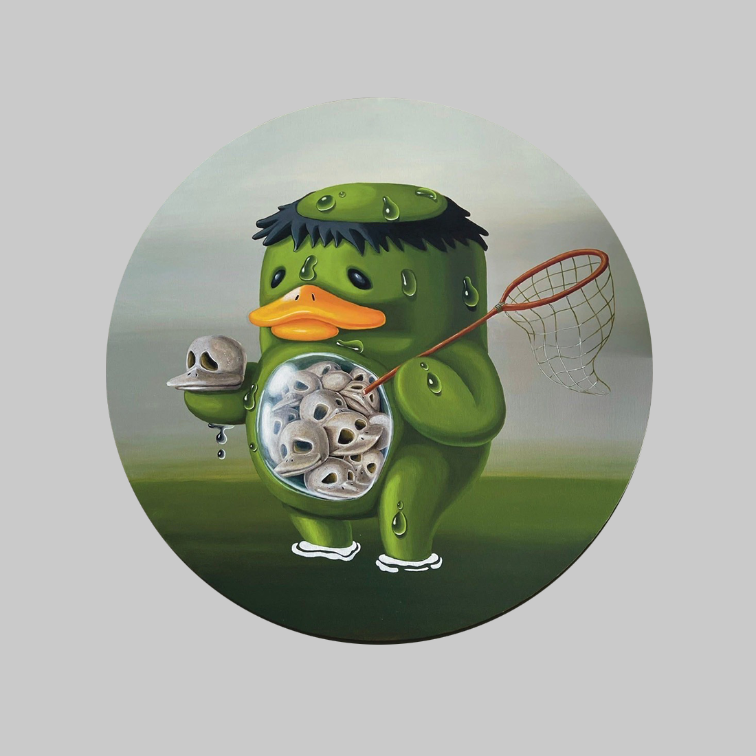이 작품은 작가 Dark Duck이 자신의 상징적인 캐릭터에 일본의 전설적인 물 요괴인 **캇파(Kappa)**의 요소를 융합하여 익살스러우면서도 섬뜩한 하이브리드 캐릭터를 창조합니다. 녹색 피부, 젖은 머리카락, 오리 부리를 가진 이 캐릭터는 캇파의 특징을 유지하면서도 작가 Dark Duck 특유의 귀여운 오리 형상을 하고 있습니다. 가장 충격적인 부분은 배 중앙에 투명한 창이 있어, 내부에 수많은 해골들이 가득 차 있는 모습을 보여준다는 점입니다. 캐릭터는 한 손에는 해골을 들고 있고, 다른 손에는 곤충 채집망처럼 보이는 그물을 들고 있어, 귀여운 외모 뒤에 숨겨진 그의 위협적이거나 수집가적인 성향을 암시합니다. 이 작품은 귀여운 이미지 속에 어둡고 충격적인 내용을 병치(juxtaposition)시켜, 팝 아트의 미학을 통해 현대 사회의 이중성과 감춰진 진실에 대한 유머러스하면서도 통렬한 풍자를 담고 있습니다.