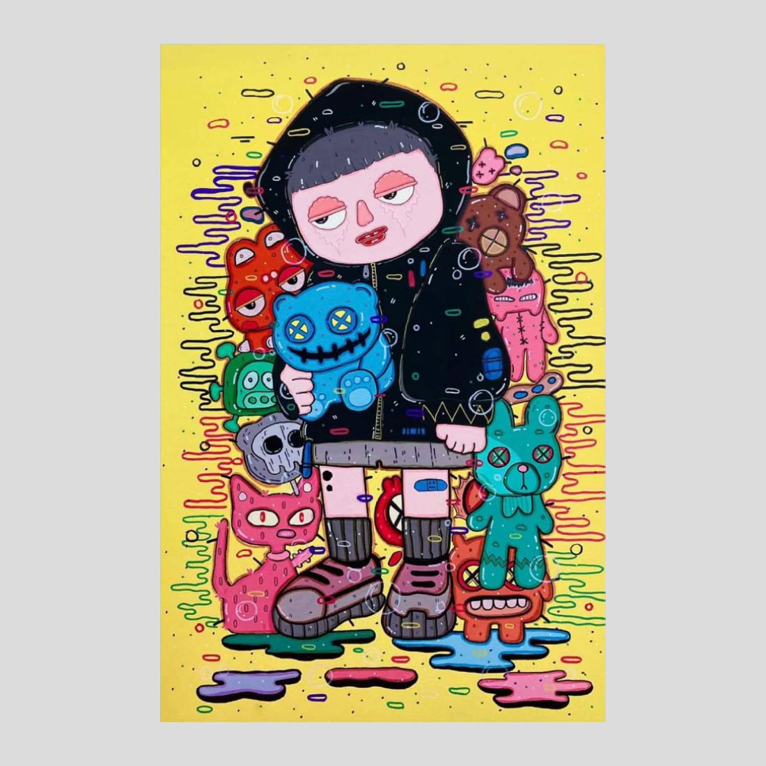 노이 인피니티, 아크릴 온 캔버스. 노란 배경 속 후드 아이가 X 눈의 파란 곰을 꼭 안는다. 주변의 경계하는 동물들, 반창고가 힘든 날을 말하지만 친절은 남는다.