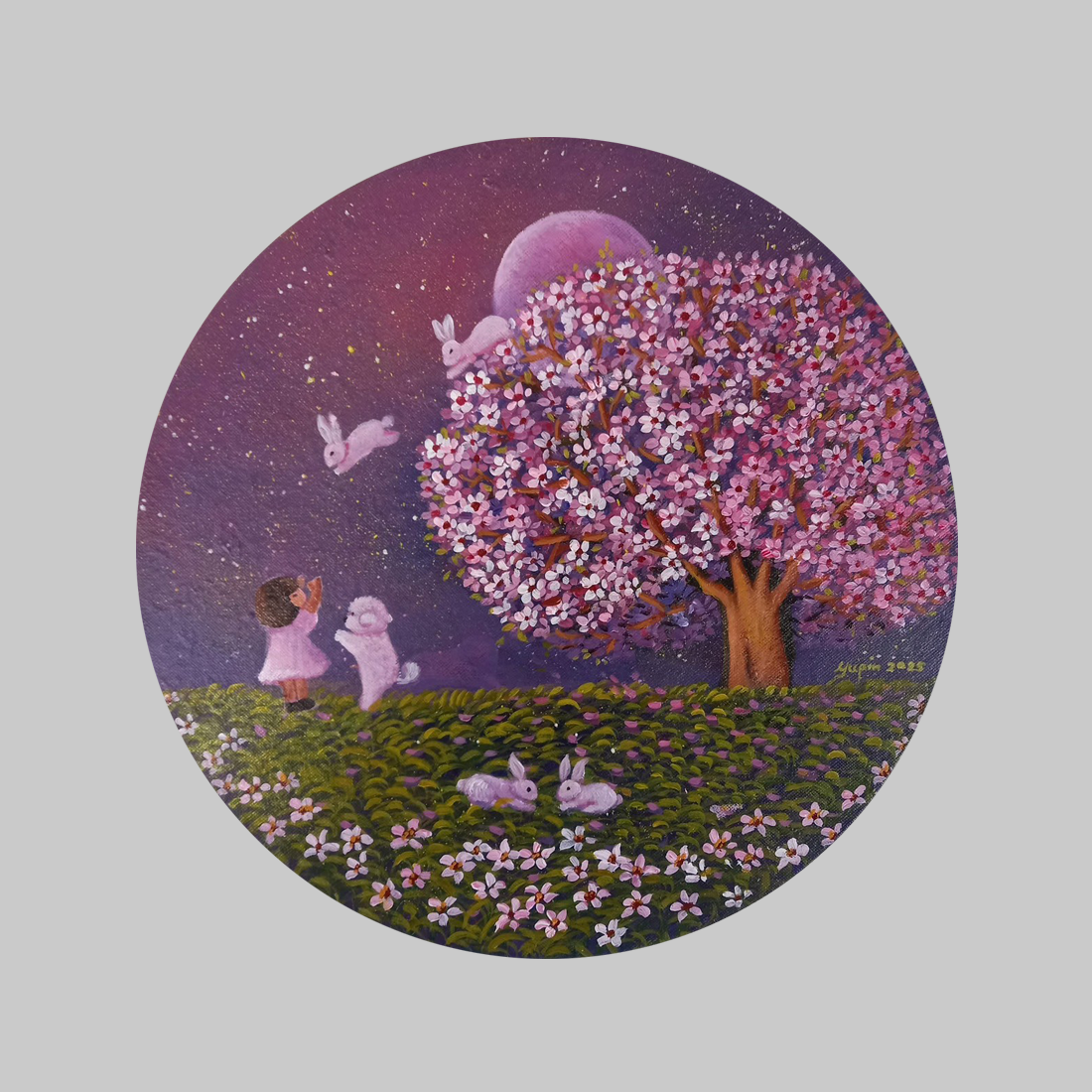 한 소녀와 그녀의 반려견이 만개한 벚나무 앞에서 날아다니는 토끼들을 향해 손을 흔듭니다. 달빛이 나무 뒤에서 부드럽게 비추며, 모든 존재가 서로를 환영하는 순간을 축복합니다. 이 작품은 순수한 만남과 따뜻한 인사의 가치를 표현합니다.”
