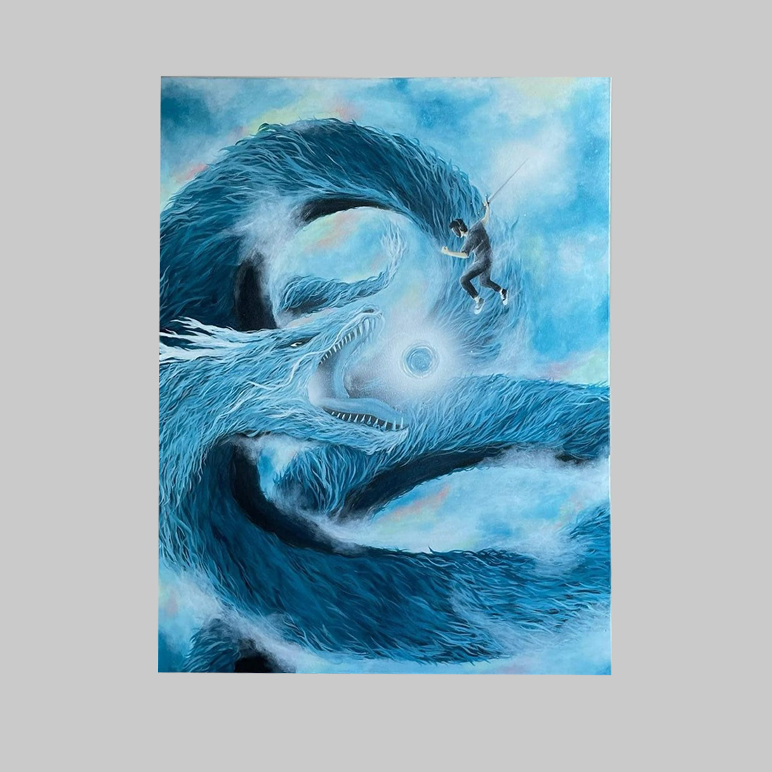 역동적인 장면은 파도와 구름으로 만들어진 거대한 푸른 용과 마주하는 한 인물을 묘사하는데, 마치 낚싯줄이나 가느다란 밧줄을 사용하는 듯합니다. 용은 내면의 두려움, 엄청난 시련, 또는 극복해야 할 도전을 상징합니다. 작지만 당당한 용의 자세는 불가능해 보이는 전투에 맞서는 용기와 의지를 보여줍니다. ‘드래곤 퀘스트’라는 제목처럼, 이 작품은 자아를 발견하고 현실의 고난을 극복하는 영웅적인 여정을 은유적으로 표현합니다.