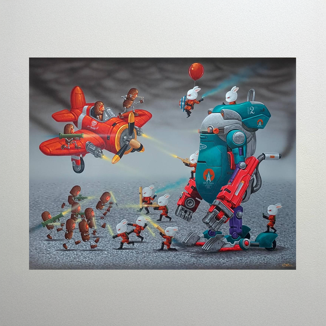 토끼 군단은 거대한 로봇의 보호를 받으며 공룡 모형과 빨간 복엽기를 탄 원숭이(혹은 다람쥐) 무리에 맞서 싸웁니다. 로봇은 손상된 것처럼 보이고, 한 토끼는 빨간 풍선을 들고 있는데, 이는 희망이나 순수함을 지키려는 절박한 의지를 보여줍니다. 이 복잡한 장면은 ‘우리 대 그들’의 갈등을 유머러스하게 묘사하며, 놀이적 요소를 통해 전쟁에 내재된 집단적 긴장과 폭력을 경시합니다.