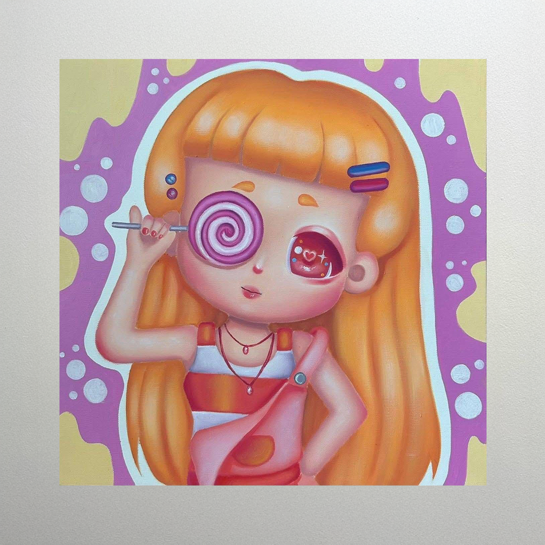 이 목요일(Thursday) 작품은 긴 주황색 머리의 소녀가 한쪽 눈을 커다란 막대사탕으로 가린 채 포즈를 취하는 모습에서 장난스러우면서도 신비로운 분위기를 조성합니다. 막대사탕의 소용돌이 패턴과 보이는 눈에 비치는 빨간색 하트는 시선을 사로잡으며, 보라색과 노란색이 섞인 배경은 생동감 넘치는 팝 아트적인 감성을 더해, 소녀가 달콤한 장난에 빠져 있음을 상징합니다.