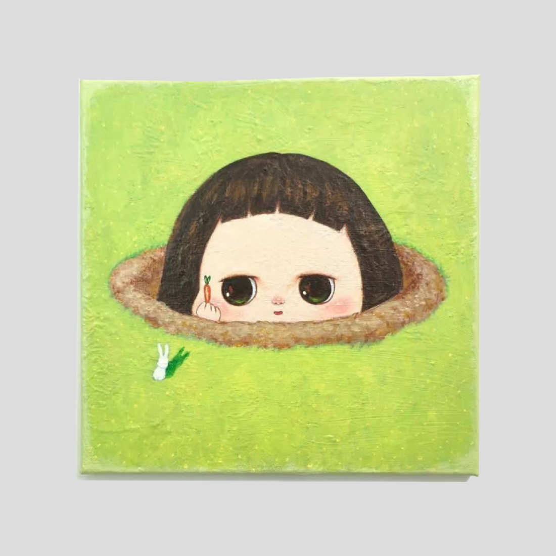 Jiro Jiro의 캔버스 작품(기법: 아크릴과 색연필)은 초록 들판 속 구멍에서 얼굴을 내민 소녀를 아기자기하게 묘사한다. 흙테 둘레에 반쯤 가려진 얼굴과 커다란 눈은 순수한 호기심을 드러내고, 소녀가 손가락에 끼운 작은 당근과 아래의 흰 토끼는 목가적 이미지를 증폭한다. 풍부한 초록의 잔디는 여러 층의 붓질과 색연필 점묘로 질감을 살렸고, 도자기처럼 매끄러운 피부와 대비를 이룬다. 전체적으로 귀여운 미학과 장난기 어린 태도가 섞여 관습적 이미지에 유머러스한 반전을 부여하는 작품이다.