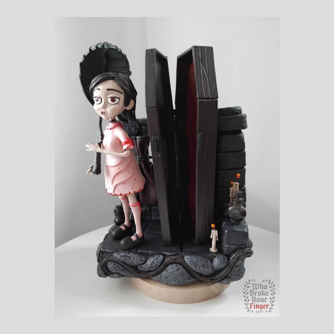 Whobrokeyourfinger Ppol의 “Lilith Lovebane”은 점토, 와이어, 폼, 아크릴 물감 등 다양한 재료를 활용해 제작한 정교한 혼합 매체 조각입니다. 이 작품은 큰 눈을 가진 창백한 소녀가 분홍색 드레스를 입고 거대한 잎사귀를 우산처럼 들고 있는 모습을 묘사합니다. 그녀 옆에는 붉은 퀼트 내피가 돋보이는 검은 관이 열려 있으며, 어두운 돌 질감의 바닥에는 녹은 촛불과 물약병들이 놓여 있습니다. 이 디오라마는 기이하면서도 사랑스러운 ‘고딕 큐트’ 분위기를 자아내며, 마치 다크 판타지 애니메이션의 한 장면을 보는 듯한 느낌을 줍니다.
