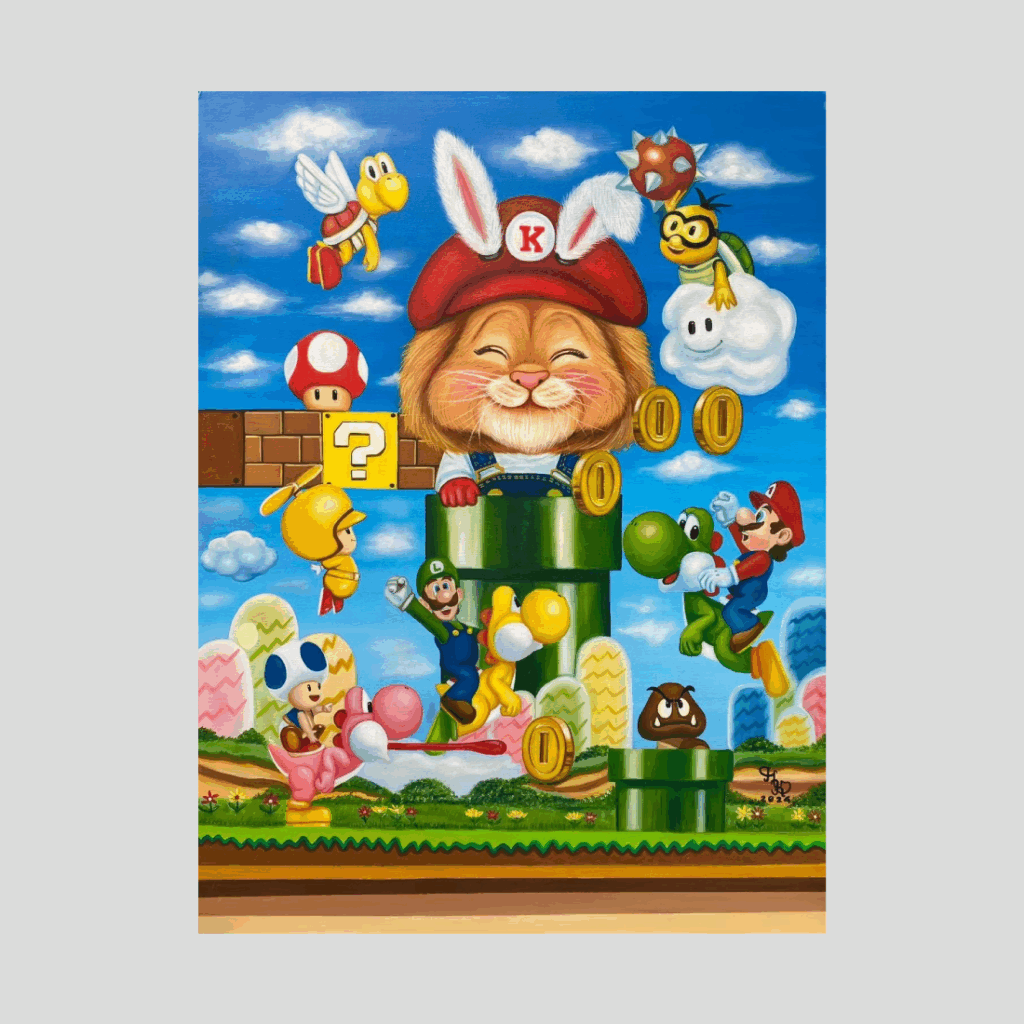 붉은 K 모자와 토끼 귀를 쓴 사자 캐릭터가 초록 파이프에서 환하게 올라와 중심을 잡는다. 코인과 ? 블록이 반짝이고, 라키투가 가시 스파이니를 흔든다. 날개 쿠파·굼바·토드·루이지, 그리고 요시와 함께 점프하는 마리오가 파스텔 언덕과 구름 사이를 누빈다. 매끈한 붓질과 화사한 캔디톤이 익숙한 게임 세계를 향수와 용기, 우정의 꿈으로 재해석한다.