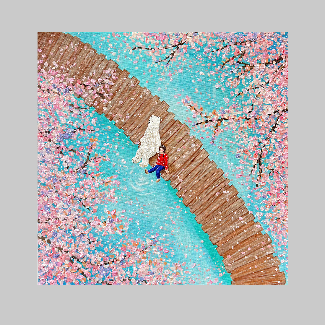 봄의 절정을 담아낸 이 작품은 위에서 아래로 내려다보는 시점을 통해 소녀와 북극곰이 맑고 푸른 물 위를 가로지르는 나무 다리 위에 함께 앉아 벚꽃이 만발한 모습을 보여줍니다. 소녀는 물에 발을 담그고 있고, 곰은 그녀 옆에 앉아 있습니다. 활짝 핀 벚꽃과 시원한 푸른 물은 자유롭고 평화로운 감정을 상징하며, 세상의 복잡함에서 벗어나 자연 속에서 순수한 순간을 보내는 두 친구의 모습을 통해 진정한 정신적 해방을 전달합니다.