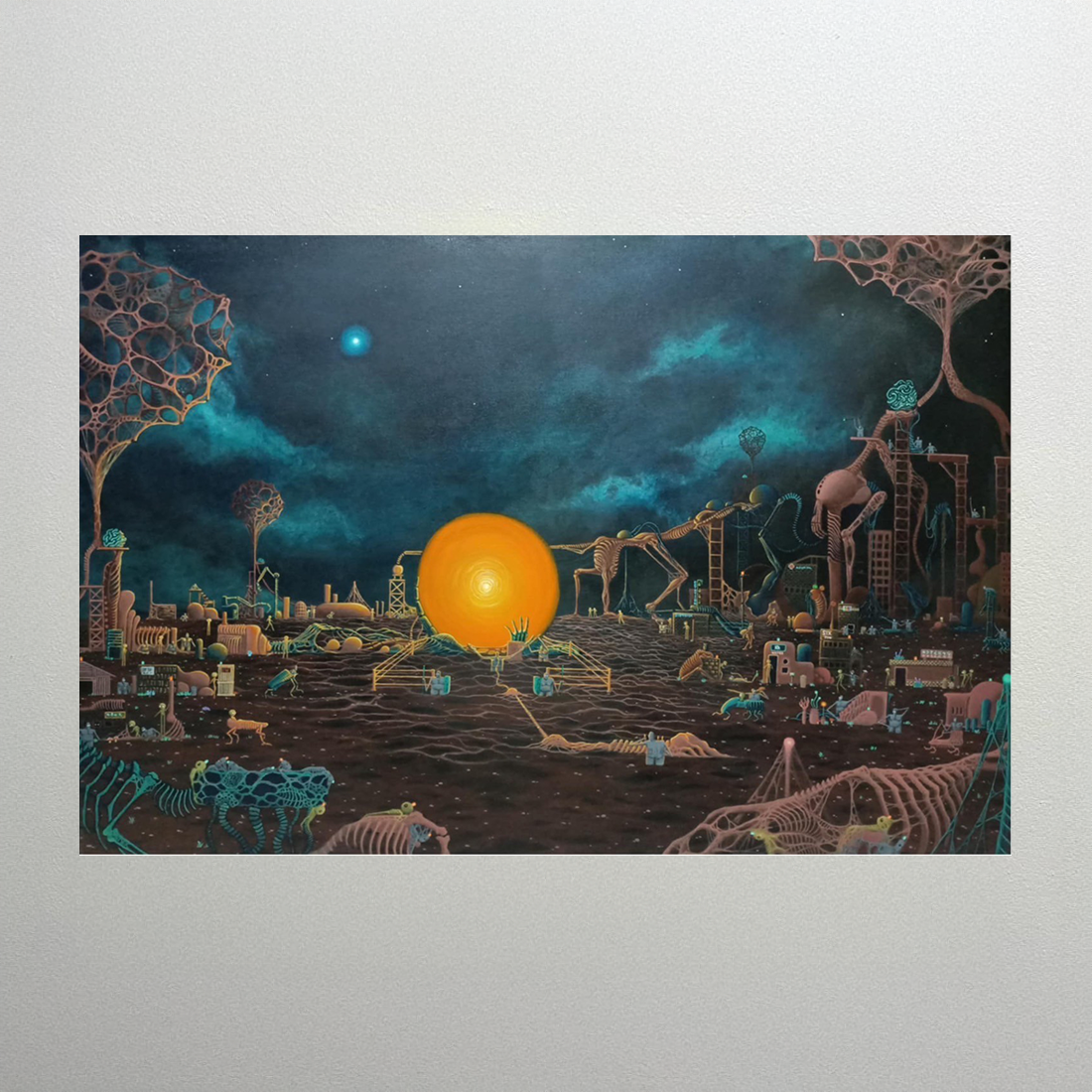 Suggesting a mysterious space, this piece depicts a labyrinthine cityscape filled with bizarre and complex structures, architectures, and mechanical devices. Like the depths of the subconscious, illogical structures are mixed together, visualizing the complexity and unfathomable mysteries of reality.