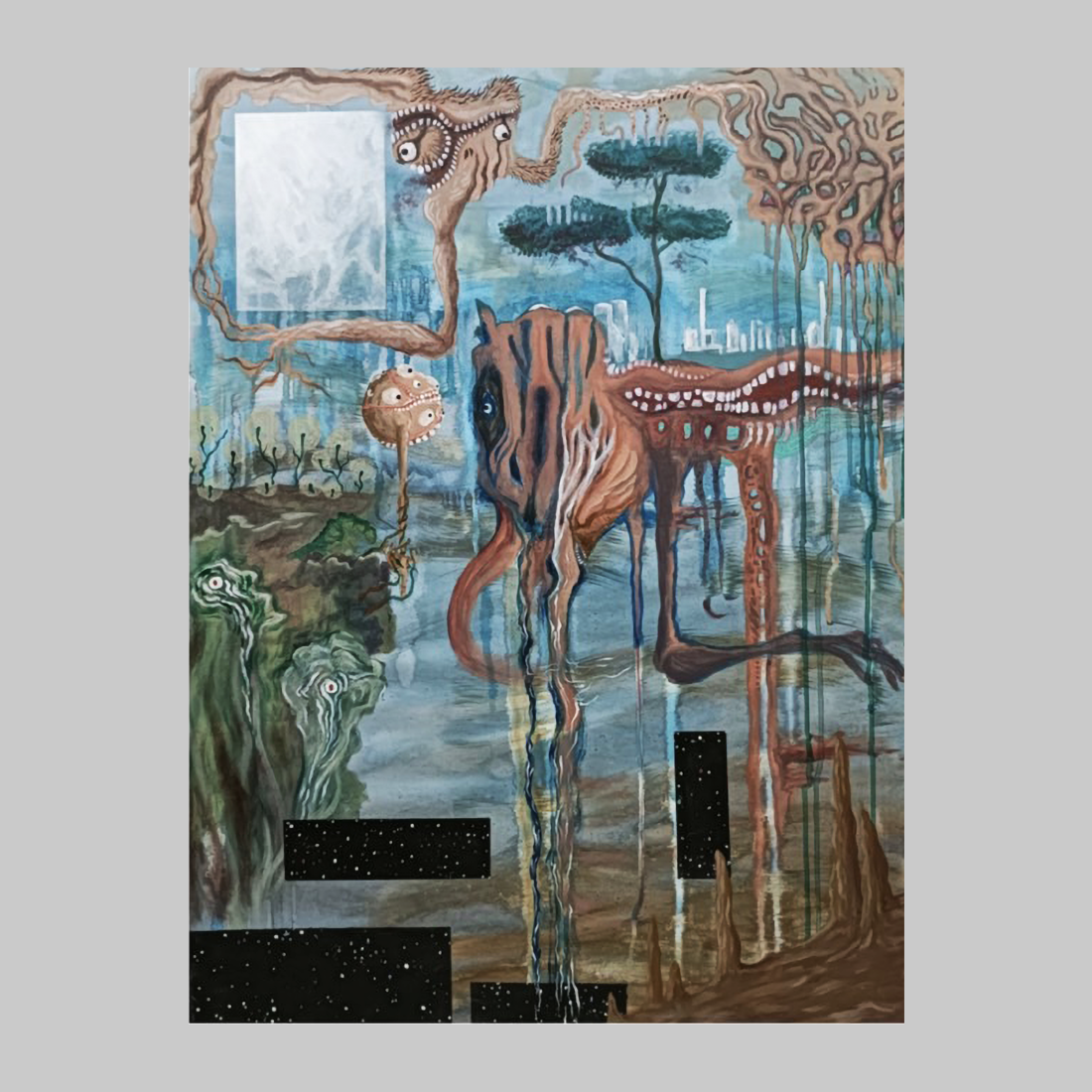 이 작품은 라틴어 제목 ‘Ante Omnia'(모든 것에 앞서)가 담고 있는, 가장 근본적이고 우선적인 존재의 본질에 대한 탐구를 시각화합니다. 화면 중앙에는 거대한 유기체-기계적 구조물이 촉수처럼 뻗은 다리를 가진 채 서 있으며, 그 주변은 흙빛, 푸른색, 녹색이 뒤섞인 불안정한 풍경이 감싸고 있습니다. 이 기이한 존재의 형상은 자연과 기계, 생명과 무기물이 뒤섞인 초월적인 원초적 힘을 암시합니다. 위쪽의 캔버스 표면에는 눈알 형태의 기관과 뼈처럼 엉킨 나뭇가지들이 그려져 있으며, 이는 파괴와 생성, 그리고 감시라는 이중적인 주제를 드러냅니다. 중앙의 거대한 눈과 그 위를 떠도는 나무는 혼돈 속에서도 변치 않는 생명력과 **가장 중요한 본질(Ante Omnia)**을 상징하는 듯합니다. 작품 전반의 강렬한 초현실적 이미지와 불안정한 색채는, 작가가 이 모든 현상과 복잡성 속에서 인간 존재나 창조의 가장 근본적인 이유를 탐구하고 있음을 보여줍니다.