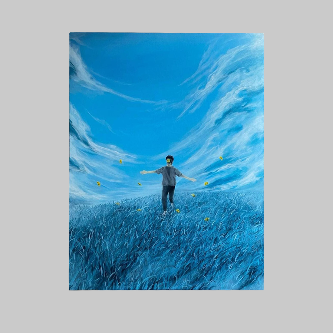 짙은 파란색 배경 아래, 거대한 두 손이 아래에서 솟아올라 하얀 연기 같은 구름에 둘러싸인 작은 인물을 감싸 안고 있습니다. 이 구도는 보호와 재발견의 감정을 표현합니다. 손목에 쓰인 “내가 당신에게 낯선 사람인가요?”라는 질문은 그 인물이 관계 속에서 자신의 존재에 대해 의문을 품고 있었다는 것을 암시하며, 이제 이 거대한 손의 발견과 포옹을 통해 내면의 안정을 되찾았다는 것을 보여줍니다.