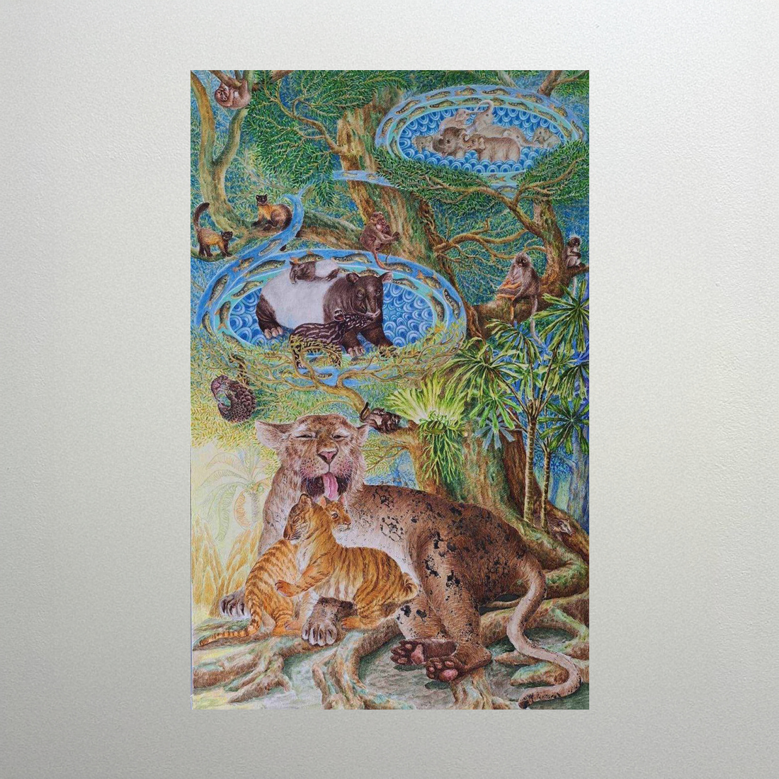 ‘보존’이라는 제목에서 알 수 있듯이, 이 작품은 자연과 생명의 순수한 ‘보존’에 대한 깊은 갈망을 보여주는 환상적인 풍경입니다. 울창하고 신비로운 숲을 배경으로, 그림의 하단 중앙에는 위풍당당한 포식자들(암사자와 새끼 호랑이 또는 표범)이 평화롭게 함께 쉬고 있는 모습이 담겨 있습니다. 특히 어미 사자와 새끼 호랑이의 모습은 종의 경계를 넘어선 조화와 공존의 가치를 강조합니다. 상단 부분에는 코뿔소 가족을 비롯한 야생 동물들이 안락한 안식처에 안전하게 자리 잡고 있습니다. 이 모든 생명들은 복잡한 뿌리와 청록색 잎사귀 속에 얽혀 하나의 통합된 생태계를 형성합니다. 작가는 이 평화롭고 신성한 숲의 모습을 통해 파괴로부터 보호해야 할 자연의 근본적인 아름다움과 생명 보존의 중요성을 설득력 있게 표현합니다.