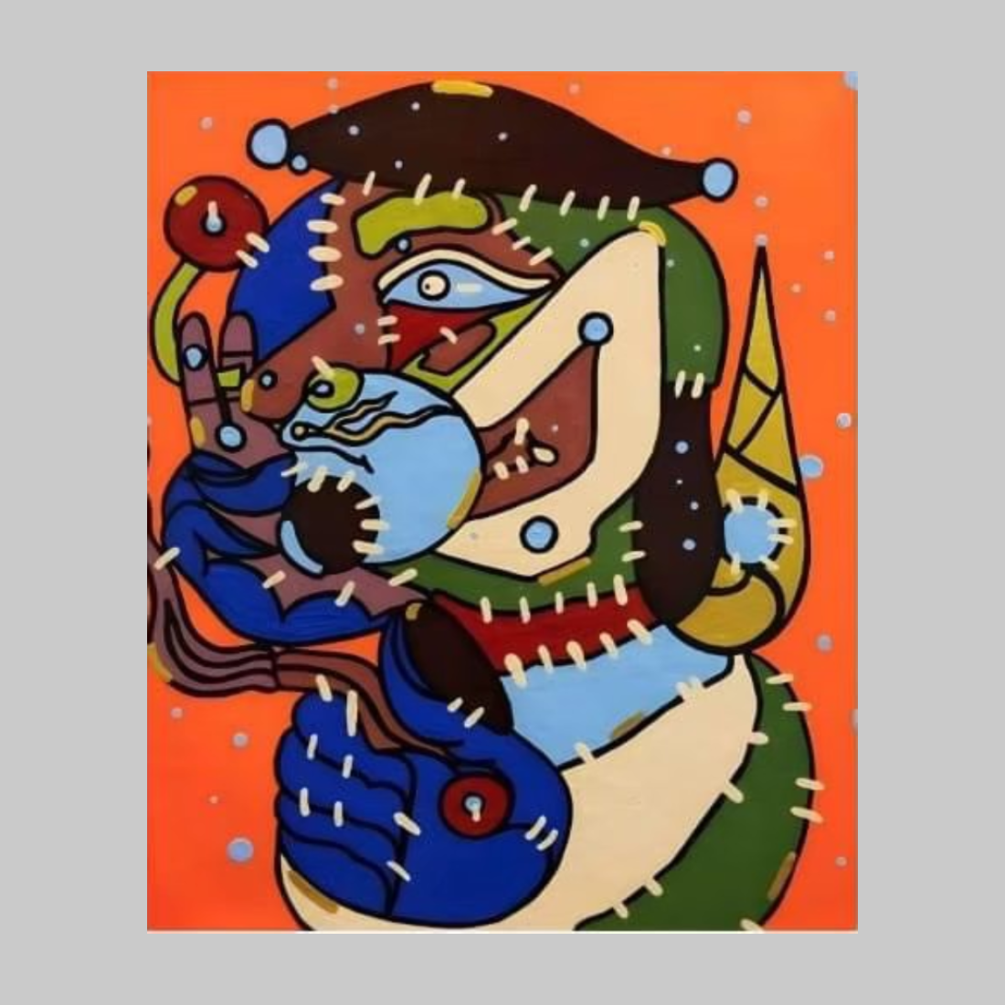 Chaiyot Pueaithamung의 이 아크릴화는 하얀 점들이 흩뿌려진 선명한 주황색 캔버스 위에 환상적인 생명체 같은 형상을 묘사합니다. 이 작품은 녹색, 파란색, 갈색 음영의 유기적 및 기하학적 형태를 혼합하여 복잡하고 정교한 디테일이 풍부합니다. 모자를 쓰고 신비로운 파란색 구체를 들고 있는 이 형상은 신화나 꿈속의 등장인물처럼 느껴집니다. 작가 특유의 하얀색 스티치는 복잡한 윤곽선을 따라가며, 이 존재가 마치 여러 아이디어와 형태의 조각보처럼 꼼꼼하게 만들어졌다는 느낌을 강화합니다.