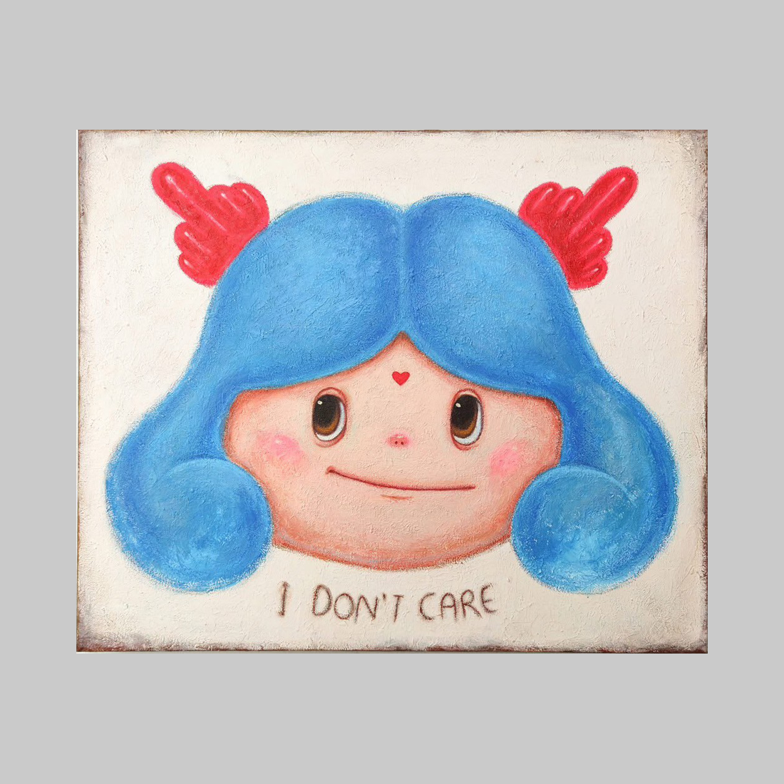 파란 머리의 아이의 얼굴에는 ‘상관없어’라는 문구가 새겨져 있습니다. 날개 모양의 장식과 미소 속에는 세상의 시선을 가볍게 무시하는 편안함이 숨겨져 있습니다. 이 작품은 타인의 판단에 얽매이지 않는 자유로운 정신을 보여줍니다.