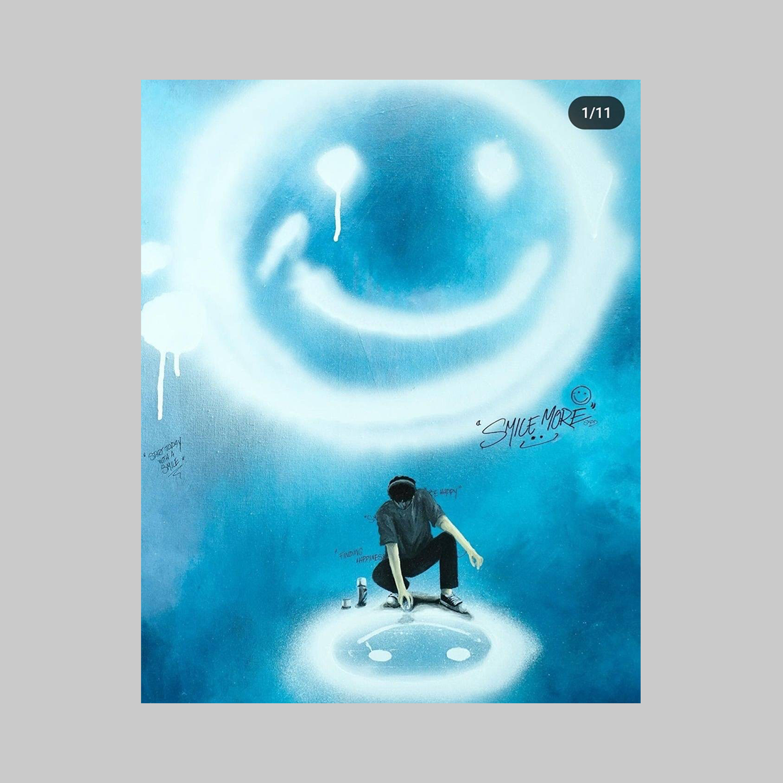 이 작품은 선명한 파란색 배경과 그래피티 스타일의 스마일리의 대비를 통해 현대 사회의 강요된 행복을 표현합니다. 위쪽에는 눈물방울이 그려진 크고 밝은 스마일리가 있고, 아래쪽에는 그 앞에 웅크리고 있는 작은 스마일리가 있습니다. “더 웃어라”라는 문구와 함께, 작가는 겉으로는 행복해 보이면서도 내면의 고통과 불안정함을 감추어야 한다는 사회적 압력을 풍자적으로 표현합니다.