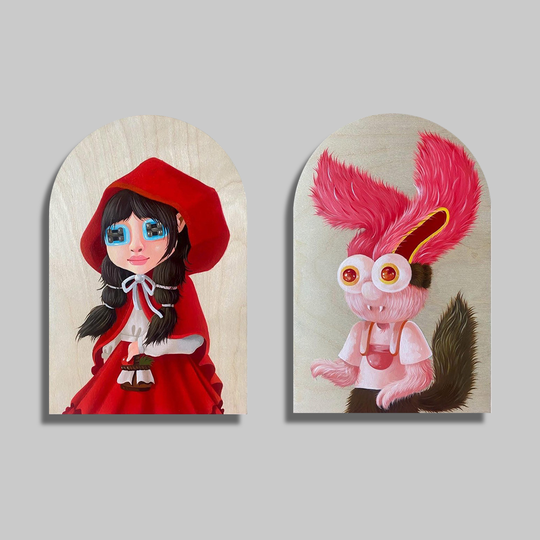시리완 시밍감(Siriwan Seemingam) 작가가 나무 위에 아크릴로 작업한 이 이연작(diptych)은 고전 동화 ‘빨간 모자’를 팝 초현실주의적인 감각으로 재해석했습니다. 왼쪽 패널에는 창문 모양의 독특한 푸른 눈을 가진 소녀가 선명한 붉은 망토를 입고 있으며, 오른쪽에는 토끼와 늑대를 결합한 듯한 분홍색 털의 기발한 생명체가 묘사되어 있습니다. 자연스러운 나뭇결이 그대로 드러나는 배경은 캐릭터의 생생한 색감과 대비를 이루며, 작가 특유의 몽환적이고 동화적인 상상력을 통해 관객에게 친숙하면서도 새로운 이야기를 전달합니다.