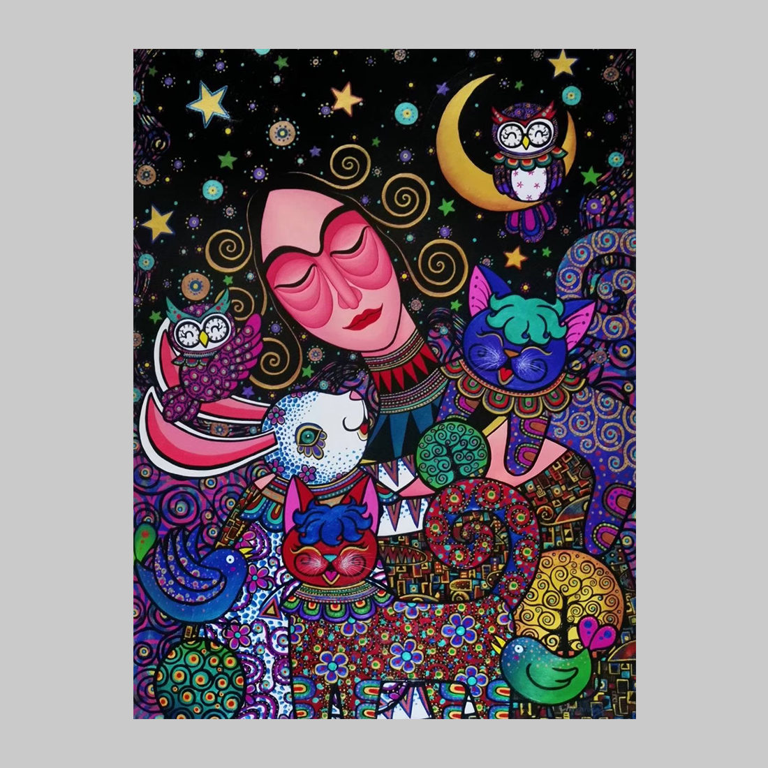 예술가 차야니사 스리위차난(Chayanisa Sriwichainan)의 ‘사랑의 낙원(Paradise of love)’은 몽환적인 밤하늘을 배경으로 강렬한 장식 패턴으로 표현된 무조건적인 사랑과 평화로 지배되는 이상적인 세계를 묘사합니다. 칠흑 같은 밤하늘은 황금빛 별과 초승달로 빛납니다. 이 신비로운 빛 아래, 한 여성이 깊은 평온함 속에서 눈을 감고 쉬고 있습니다. 그녀는 토끼, 고양이, 올빼미, 새 등 다양한 동물 친구들에 둘러싸여 있으며, 모두 생동감 넘치는 모티프로 장식되어 있습니다. 모든 존재는 클림트 양식을 연상시키는 섬세하고 복잡한 패턴으로 뒤덮여 있어 단순한 동물이 아니라 신화적이고 영적인 존재임을 암시합니다. 여성의 평화로운 표정과 동물들의 조화로운 배치는 다양한 존재들이 서로에게 위안과 위로를 주며 완벽한 조화를 이루는 영적인 안식처, ‘사랑의 낙원’을 시각화합니다.