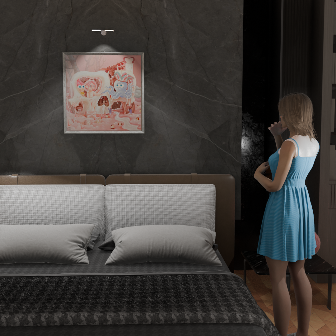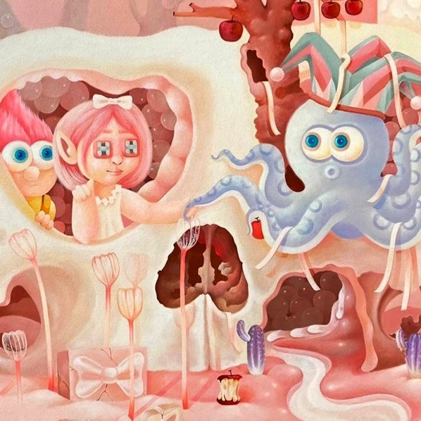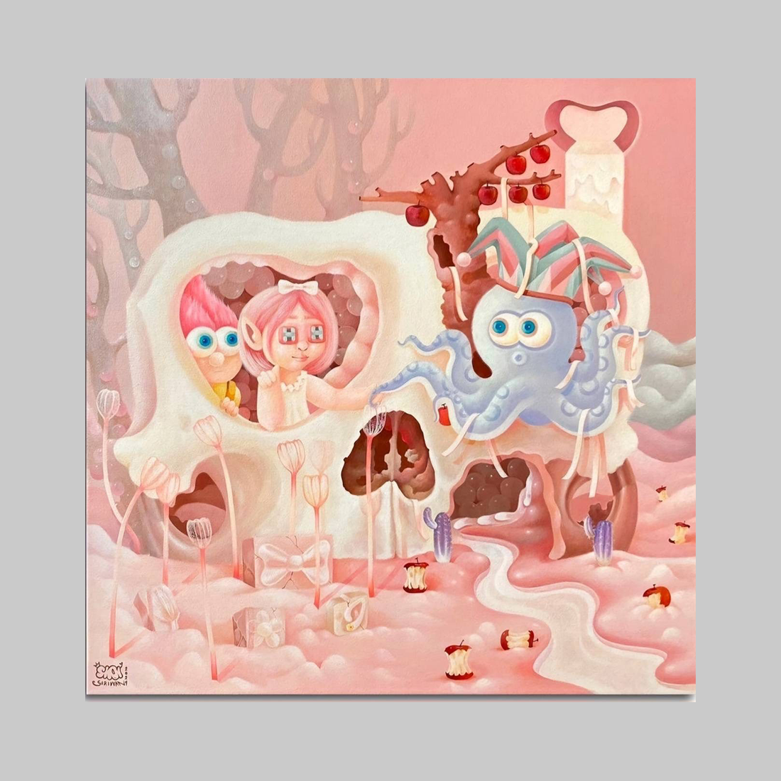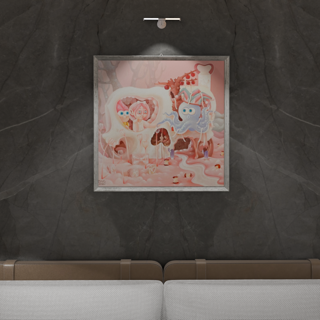 이 작품은 파스텔 핑크색의 초현실적인 풍경 속에서 동화적인 이미지를 사용하여 죽음과 낭만적인 상실이라는 무거운 주제를 다룹니다. 중앙에 있는 거대한 해골은 과거의 기억이나 사라진 사랑의 잔해를 상징합니다. 해골의 눈구멍 내부에는 두 개의 작은 인형 같은 형상이 다정하게 서 있는데, 이는 상실에도 불구하고 영원히 지속되는 기억이나 유대를 은유합니다. 토끼 귀를 가진 문어와 같은 기괴한 존재가 해골 옆에 서 있어, 사랑이 끝난 후에 찾아오는 혼란과 기묘한 감정 상태를 시각적으로 나타냅니다. 이 작품은 사랑이 남긴 파괴와 재생의 흔적을 낭만적이면서도 섬뜩한 방식으로 탐구합니다.