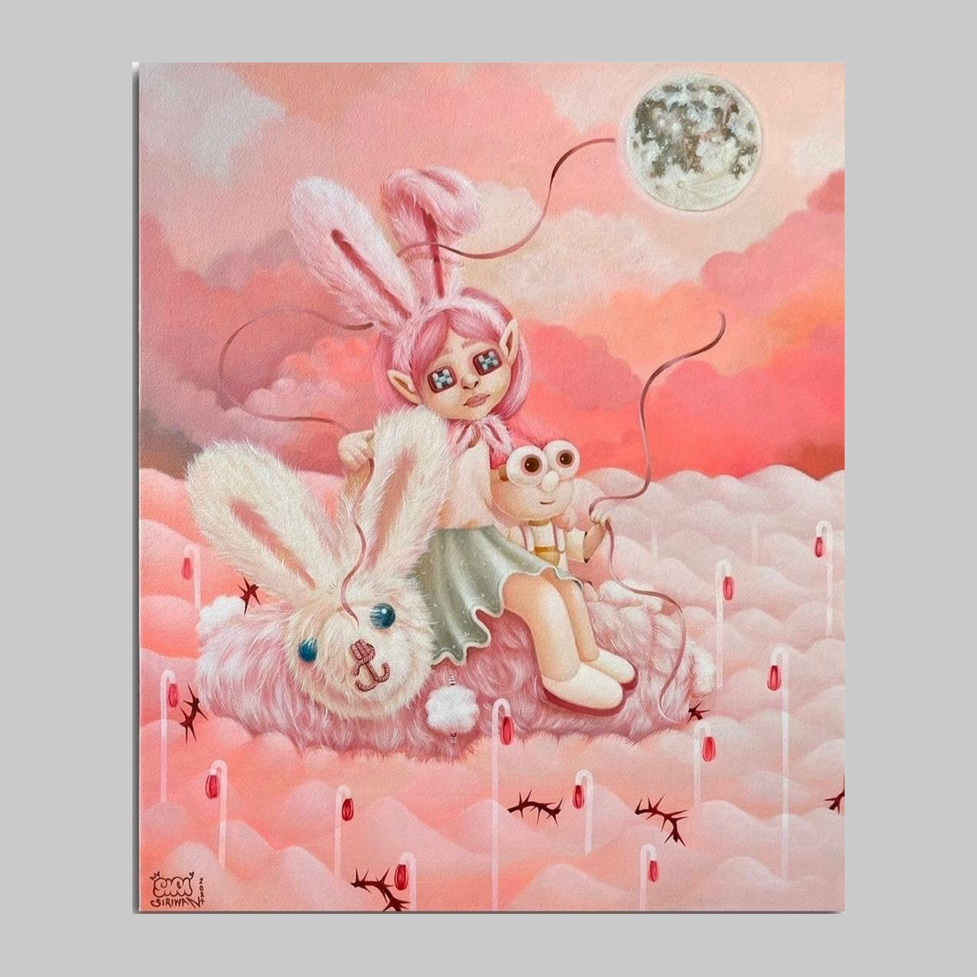 부드러운 분홍색과 주황색 색조가 지배하는 꿈결 같은 하늘 아래, 토끼 귀를 단 소녀가 구름 위를 떠다니는 거대한 토끼 인형 위에 앉아 있습니다. 커다란 푸른 눈동자를 가진 그녀의 눈은 순수하면서도 애잔한 시선을 전달하며, 마치 세상 전체를 응시하는 듯합니다. 아래쪽에 있는 붉은 깃발 같은 물체들은 이 꿈같은 세계에도 현실과의 경계가 여전히 존재함을 시사합니다. 이 작품은 **’사랑 후의 세계’**를 슬픔과 고독 속에서도 새로운 종류의 순수함과 희망이 피어나는 개인적인 안식처로 해석합니다. 토끼 인형과 소녀는 위안과 자기애를 상징하며, 상실 이후에도 계속되는 삶의 꿈결 같은 여정을 보여줍니다.