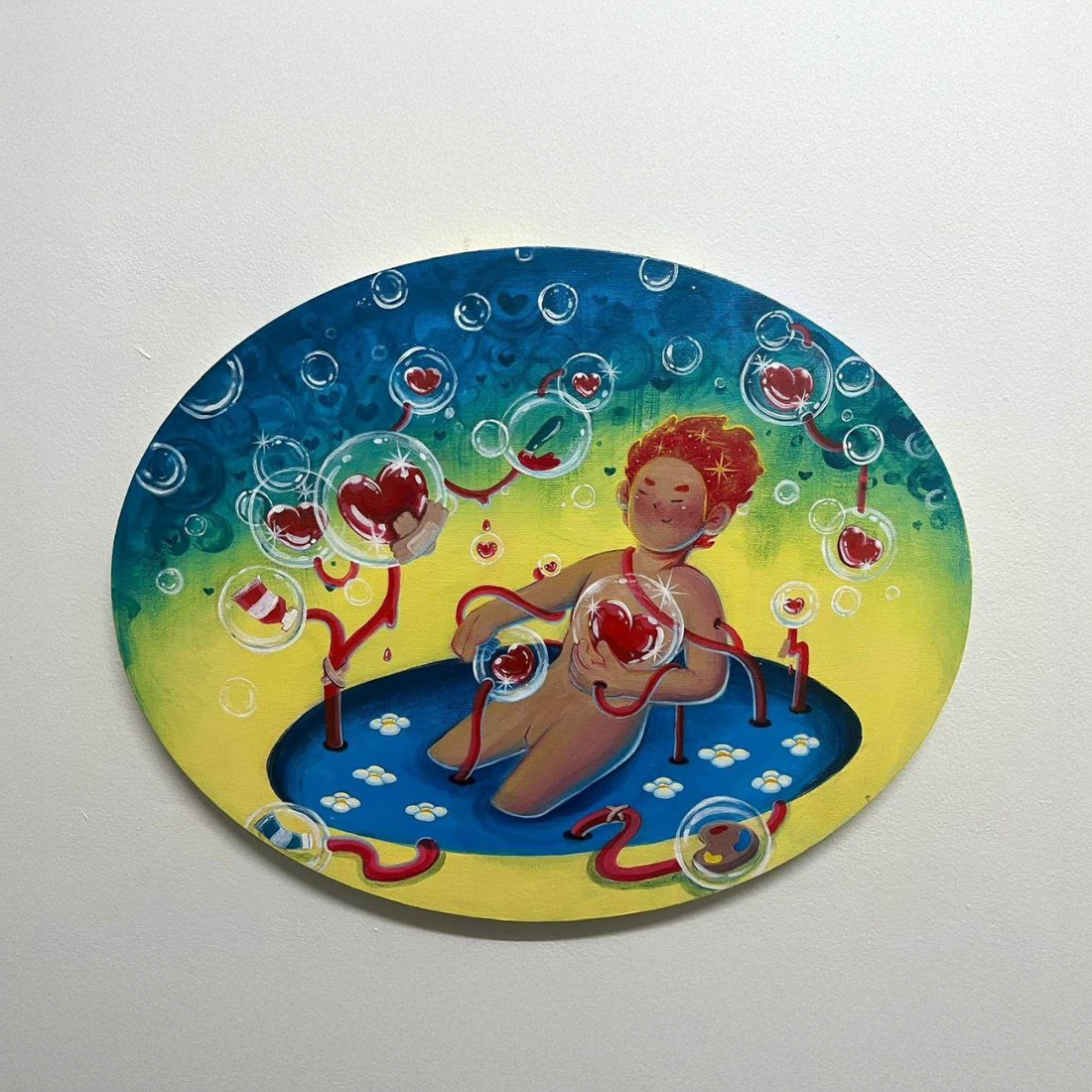 ‘새해 새 마음’이라는 제목에서 알 수 있듯이, 이 작품은 한 해의 시작과 함께 새로운 희망과 감정을 맞이하는 순간을 몽환적으로 표현합니다. 작품의 중심 인물은 비눗방울 안에 떠다니는 붉은 하트 모양의 ‘하트’들에 둘러싸여 수영장(혹은 욕조)에 누워 있습니다. 이는 과거의 감정(비눗방울)을 정리하고 새해를 위한 새로운 ‘하트’와 ‘사랑’을 수확하거나 교환하는 초현실적인 행위를 상징합니다. 밝은 노란색과 파란색 배경은 낙관적이고 희망찬 미래를 암시하며, 작가는 이 경쾌하면서도 기묘한 이미지를 통해 자기 성찰과 부활의 메시지를 전달합니다.