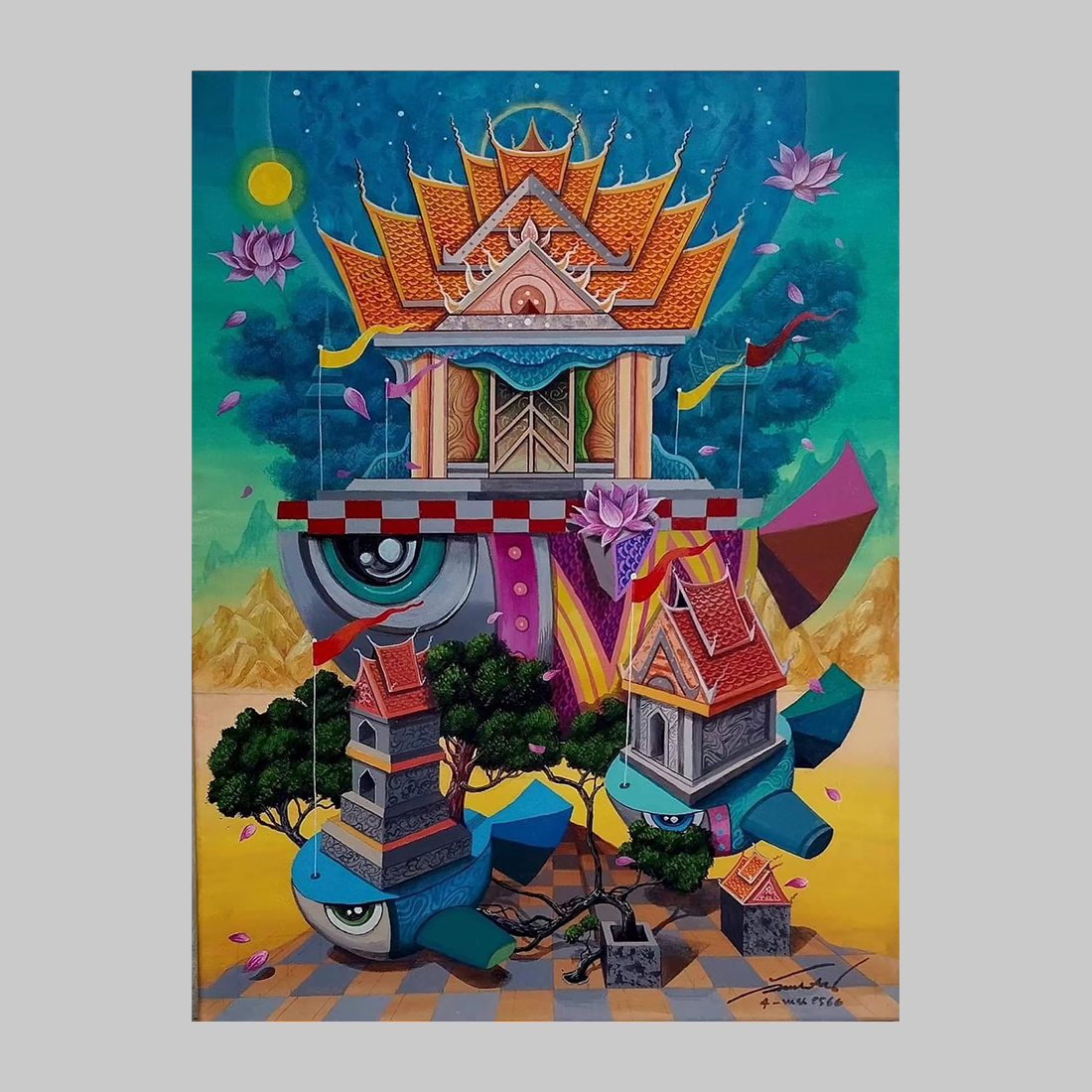 이 작품은 하늘에 떠 있는 듯한 건축물과 바닷속 신비로운 세계를 동시에 보여주며, 말 그대로 ‘색채와 상상력의 공간’을 만들어냅니다. 태국 전통 사원과 가옥들이 겹겹이 쌓여 거대한 ‘섬’을 이루고, 기이한 생물과 유물들이 푸른 바닷속 깊은 곳에 가라앉아 있습니다. 밝고 경쾌한 지상의 구조물과 깊고 푸른 심연의 대비는 현실과 꿈, 의식과 잠재의식을 분리하고 연결하는 초현실적인 감각을 전달합니다. 작가는 이 환상적인 구조물을 통해 영혼의 고향이나 잃어버린 낙원에 대한 향수를 시각화합니다.