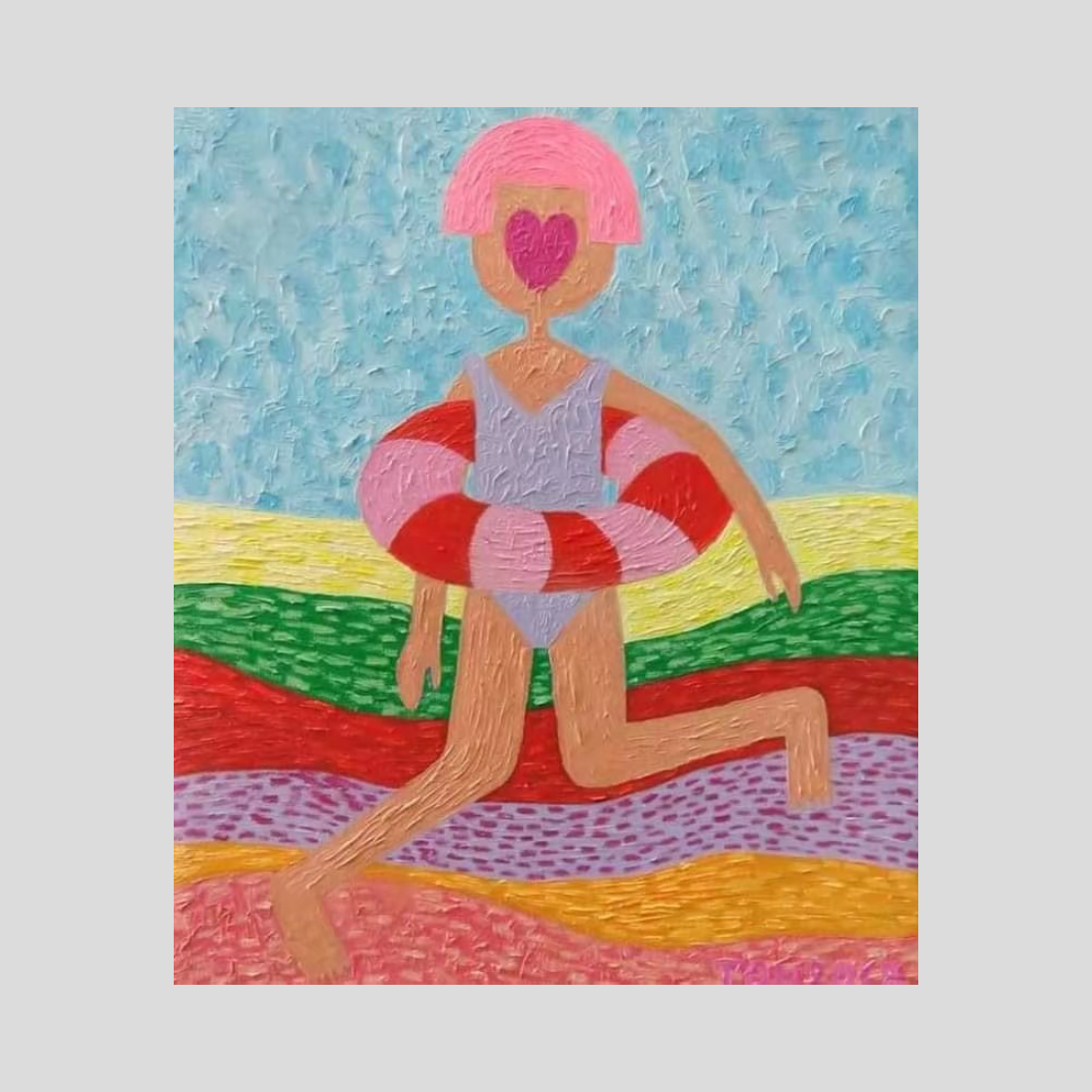 Mr. Tontrakool의 이 생동감 넘치는 유화는 초현실적인 해변을 닮은 다채로운 물결 모양의 풍경을 가로질러 걷고 있는 엉뚱하고 귀여운 인물을 포착했습니다. 인물의 얼굴은 분홍색 하트로 장난스럽게 가려져 있어, 구체적인 이목구비보다는 감정과 보편적인 정체성을 강조합니다. 줄무늬 튜브를 끼고 있는 이 캐릭터는 여름과 여유의 정신을 완벽하게 구현합니다. 작가 특유의 두껍고 질감 있는 붓터치는 바닥의 다채로운 색 띠에 깊이를 더해, 표면이 마치 살아 움직이는 듯한 촉각적인 느낌을 줍니다.