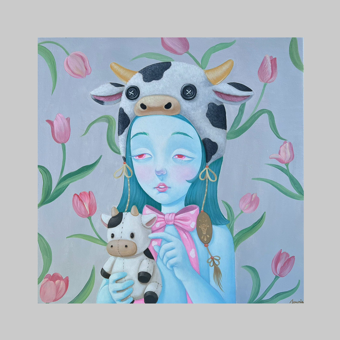 작가 **Saengrawee Klangmanee (쌩라위 끌랑마니)**의 ‘OX(소)’는 꿈결 같은 색채와 동물 모티프를 통해 순수하고 연약한 자아를 섬세하게 탐구합니다. 이 작품은 푸른 피부와 붉은 눈가를 가진 소녀가 젖소 무늬 모자를 쓴 모습을 묘사합니다. 배경은 분홍색 튤립 패턴으로 채워져 아늑하면서도 기묘한 분위기를 조성합니다. 소녀는 자신의 의상과 닮은 작은 젖소 인형을 가슴에 꼭 안고 있으며, 쇄골 근처에는 커다란 분홍색 리본이 매여 있습니다. 차가운 푸른 피부와 다소 지친 듯한 시선은 내면의 고독이나 예민함을 암시하는 반면, 젖소 모자와 인형은 순수함과 친밀한 동반자 관계를 상징합니다. 흔히 강인함이나 성실함을 상징하는 제목 ‘OX(소)’는 그녀의 연약한 외모와 대비되어, 연약함 속에서도 자신을 지키기 위한 내면의 힘을 은유적으로 시사합니다.