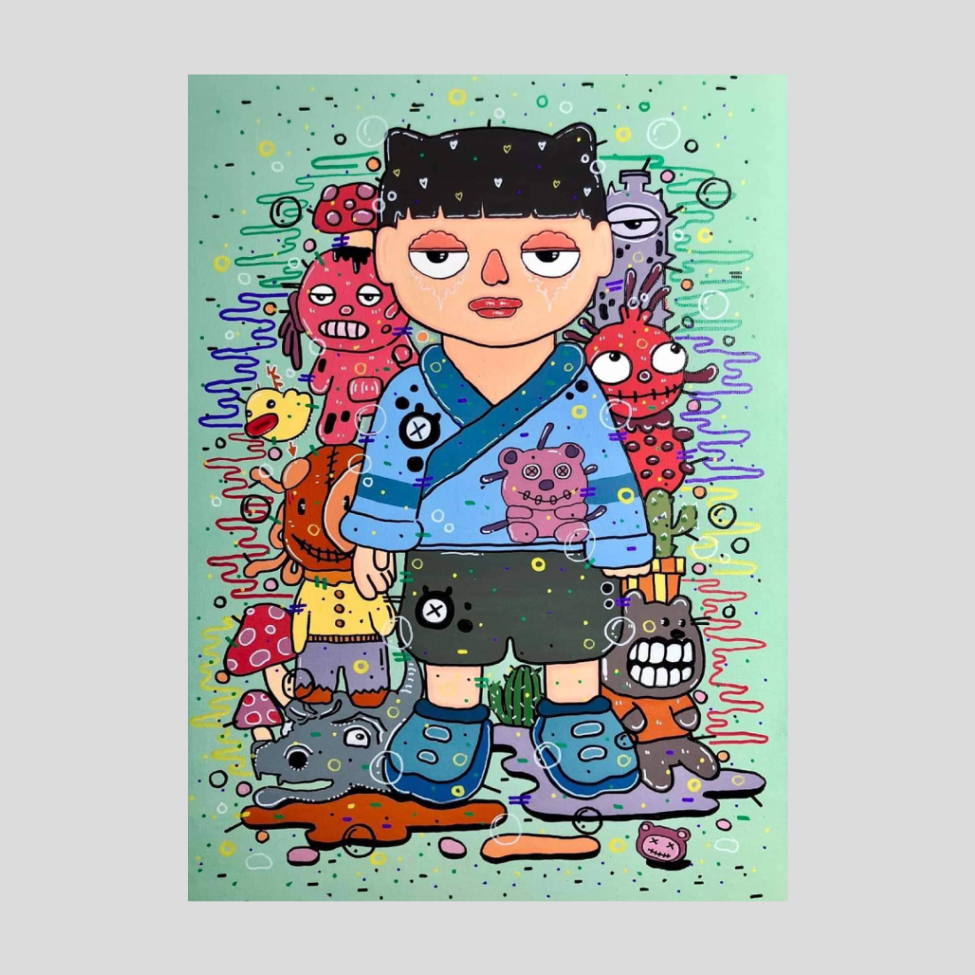 노이 인피니티, 아크릴 온 캔버스. 청색 도복 셔츠의 아이가 봉제 인형과 버섯, 선인장 사이에 선다. 점과 거품이 부드러운 갑옷을 그려 상상이 여린 마음을 지킨다.