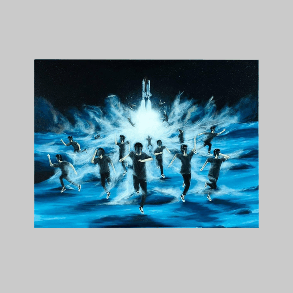 눗다나이 시리켓의 작품. 별이 빛나는 밤, 빛나는 푸른 지면 위로 인물들이 뛰고 있습니다. 배경의 우주왕복선 발사는 강력한 섬광을 일으키며 역동적이고 혼란스러운 에너지가 가득한 초현실적인 장면을 연출합니다.