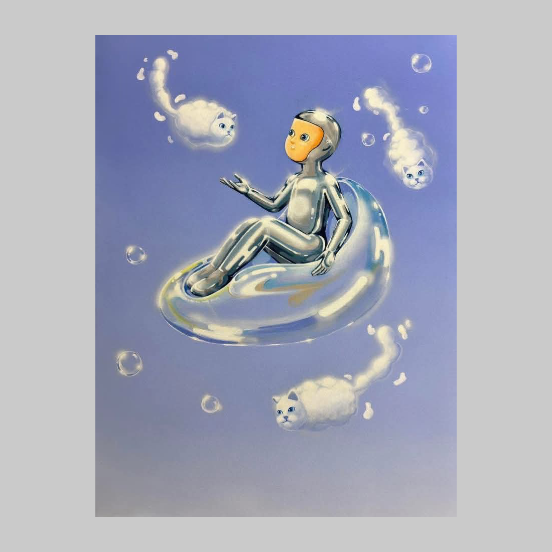 작가 **Sutee Lekpanyawat (수티 렉빤야왓)**의 ‘Safe Zone Safe Me No.3’은 고독한 자아의 평화로운 안식처를 공상과학 동화의 이미지로 해석합니다. 은색의 로봇 같은 형상이 커다란 투명한 거품 위에 앉아 하늘을 떠다니고 있습니다. 로봇의 얼굴은 차가운 금속 몸체와 대비되는 따뜻한 살구색으로 칠해져 있어, 남아 있는 인간적인 감정을 암시합니다. 인물을 둘러싼 솜털 같고 순백의 고양이들은 거품과 함께 떠다니며 이상적이고 순수한 동반자 관계를 상징합니다. 이 거품은 세상의 혼란으로부터 일시적으로 분리된 깨지기 쉬운 보호막이자 **’안전지대(Safe Zone)’**에 대한 은유 역할을 합니다. 이 작품은 고립 속에서 자신을 보호하려는 현대인의 심리적 필요와 가장 순수한 형태의 연결에 대한 내면의 갈망을 꿈결 같고 평온한 비전을 통해 표현합니다.