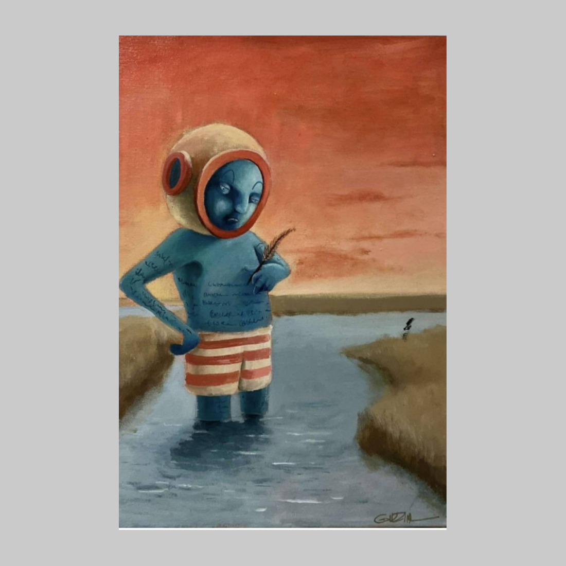 이 작품은 붉은 석양이 드리운 듯한 신비롭고 황량한 풍경을 배경으로, 강물 속에 서 있는 거대한 인물을 묘사합니다. 푸른 피부의 인물은 오래된 잠수 헬멧과 빨간색 줄무늬 수영복 하의를 착용하고 있으며, 신체 일부에는 알 수 없는 문자들이 새겨져 있어 미스터리한 존재감을 더합니다. 그는 한 손을 허리에 얹고 다른 손으로는 나뭇가지 또는 뿌리처럼 보이는 것을 들고 있습니다. 그의 시선은 고요하지만 공허하며, 강물이 굽이쳐 나가는 저 멀리에는 작은 검은색 실루엣의 인간 형상이 홀로 서 있어 고독과 거리감을 극대화합니다. 작가 Gid Zim은 이 초현실적인 이미지를 통해 알 수 없는 환경 속에서 자기 성찰의 시간을 갖는 고립된 존재의 모습을 표현합니다. 이는 현대인이 외부 세계와 단절된 채 내면의 깊은 곳을 탐험하는 과정을 은유적으로 나타냅니다.