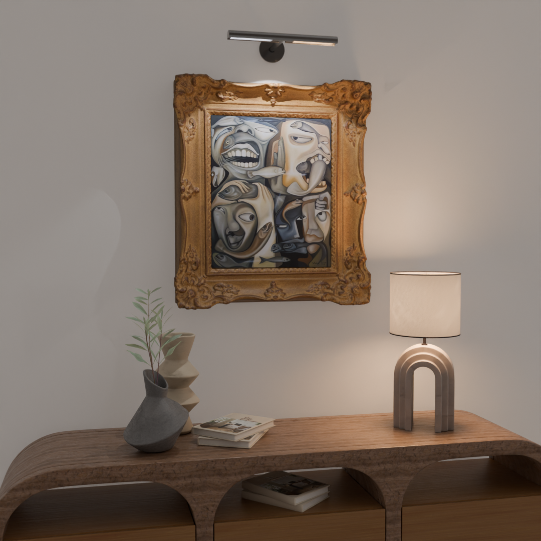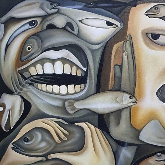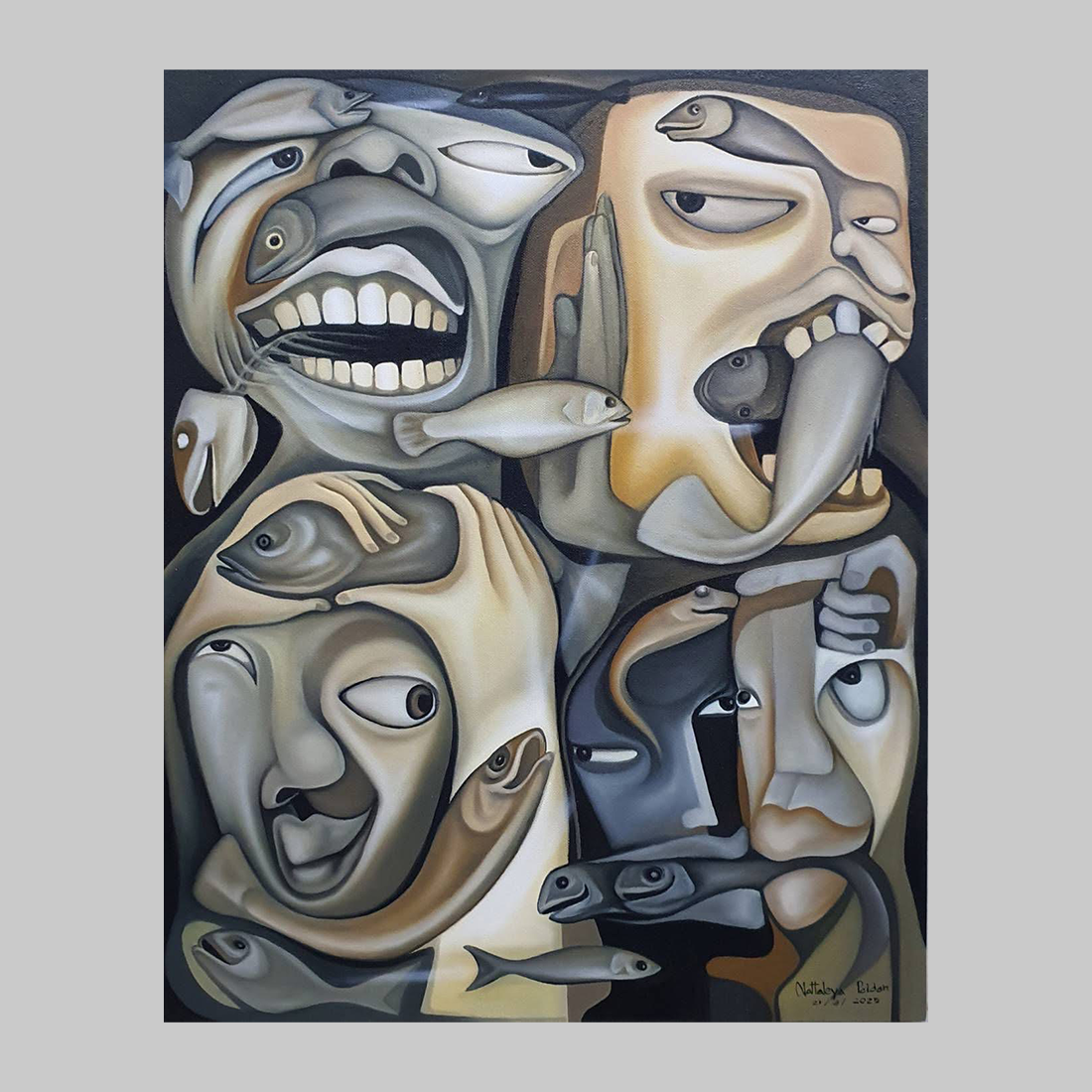 이 작품은 네 개의 주요 얼굴 형상이 뒤얽혀 있는 초현실적인 구성을 보여주며, 인물들의 얼굴은 고통, 탐욕, 혹은 침묵을 암시하는 격렬하고 왜곡된 표정을 짓고 있습니다. 전반적으로 회색, 갈색, 베이지색의 차분하면서도 불안정한 색조가 지배적입니다. 특히 눈에 띄는 것은 작은 물고기들이 인물들의 입속, 손, 그리고 얼굴 주변에 배치되어 있는 것입니다. 물고기는 종종 희생이나 침묵을 상징하며, 이는 인물들의 감정이 말이나 논리 대신 원시적이거나 억압된 방식으로 표현되고 있음을 시사합니다. 한 인물은 크게 입을 벌리고 비명을 지르는 듯하고, 다른 인물은 손으로 귀를 막거나 입을 막으려는 듯합니다. 작가 Nattaleya Paidan은 이 혼란스럽고 밀도 높은 이미지를 통해 인간 관계 속에서 발생하는 소통의 부재, 상호 작용의 고통, 그리고 억압된 욕망에 대한 깊은 심리적 통찰을 제공합니다.