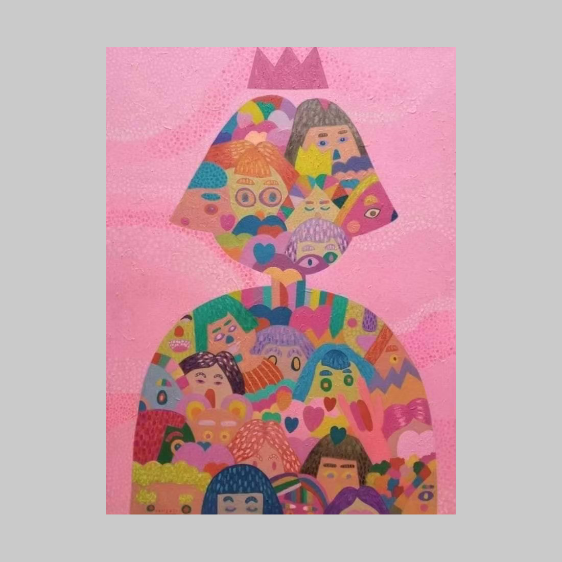 강렬한 분홍색 배경 위로 왕관을 쓴 한 왕자의 상반신 실루엣이 떠오릅니다. 그 윤곽 안에는 수많은 얼굴들이 빽빽하게 채워져 있으며, 각 얼굴은 서로 다른 표정과 색, 감정을 드러냅니다. 이 작품은 한 개인의 내면이 단일한 정체성이 아니라, 경험과 기억, 욕망과 불안이 겹겹이 쌓인 복합적인 세계임을 시각적으로 보여줍니다. 왕자는 아직 완성되지 않은 존재로서, 자신 안에 공존하는 다양한 목소리와 감정들을 배우고 마주하는 단계에 서 있습니다. 여기서 ‘왕자’는 통제와 권위의 상징이기보다는 성장과 탐색의 상징입니다. 이 얼굴은 지배하기보다 이해하려는 자아이며, 혼란스러운 내면을 끌어안고 앞으로 나아가려는 과정 그 자체를 상징합니다.