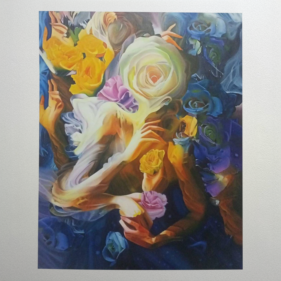 **”여자의 정서 상태(Women’s emotional state)”**라는 제목이 암시하듯, 이 작품은 꽃과 인간의 형태를 융합하여 여성의 감정적 풍경이 지닌 복잡하고 다층적인 측면을 표현합니다. 중앙 인물은 얼굴 대신 활짝 핀 흰 장미를 가지고 있으며, 그 주위는 노란색, 분홍색, 그리고 신비로운 파란색 장미들이 뒤섞여 있습니다. 이 꽃들은 기쁨, 순수, 슬픔, 불가사의함 등 여성의 내면세계를 구성하는 다양한 감정들을 상징합니다. 여러 개의 팔과 손이 서로 껴안고 만지는 듯한 구도는 감정들이 격렬하게 혼합되는 모습, 혹은 이러한 감정들을 붙잡아두려는 강렬한 욕망과 내적 갈등을 암시합니다. 풍부한 색감과 부드러운 유화 기법은 관능적이면서도 꿈결 같은 분위기를 조성하며, 단순하게 정의할 수 없는 여성 감정의 복합적이지만 아름다운 세계를 시각적으로 구현합니다.